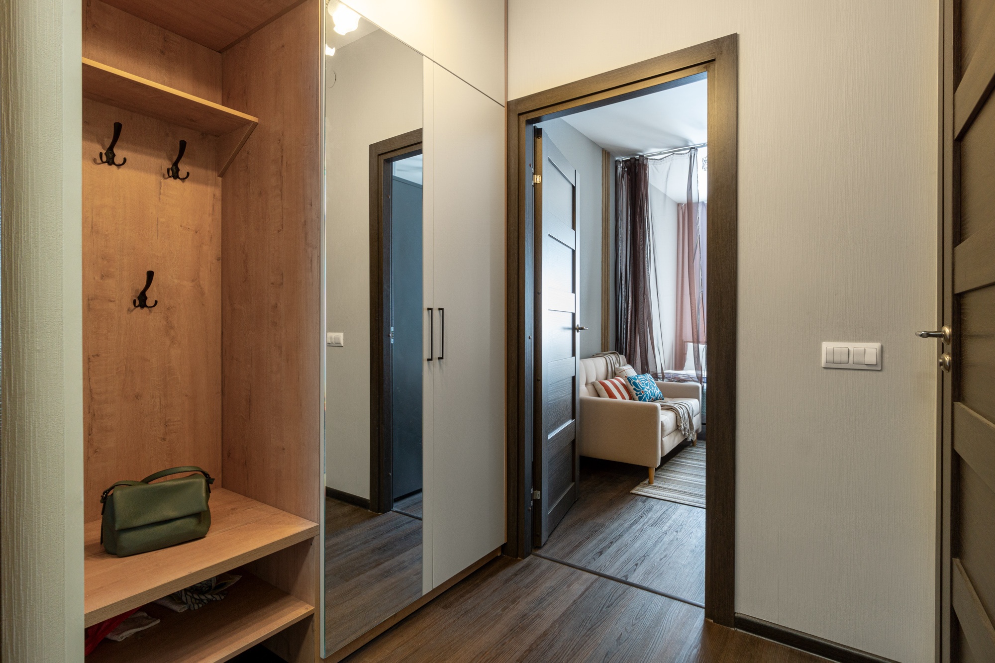 - Объемный шкаф и вешалка для размещения вещей.