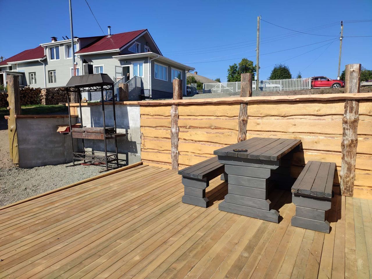 Стилизованная под старину баня на берегу с примыкающей к ней открытой террасой с уличной мебелью.
