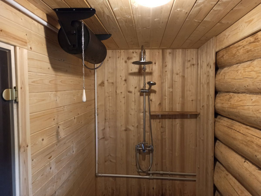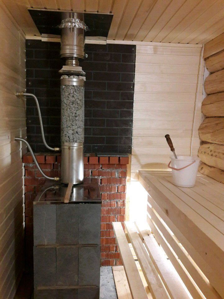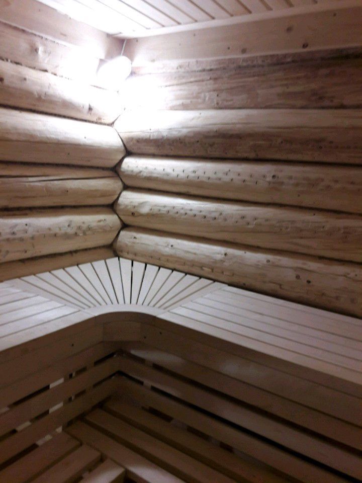 Русская баня из бревна с дровяной печью с закрытой каменкой, облицованной талькохлоритом, с выходом на пирс.