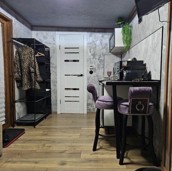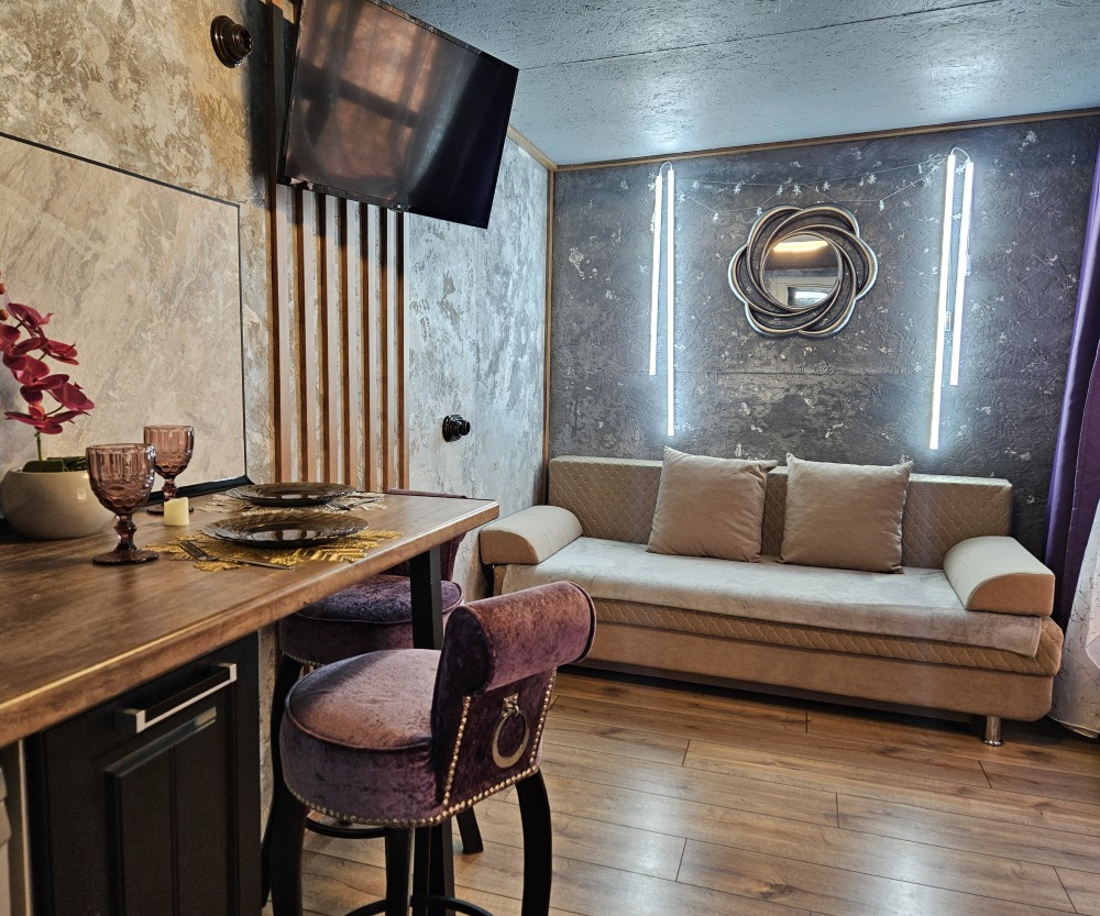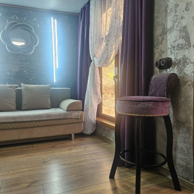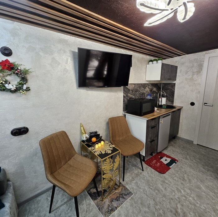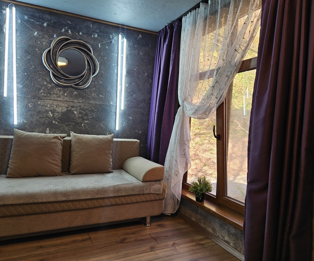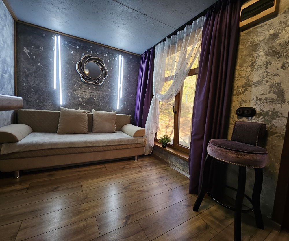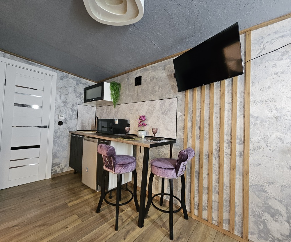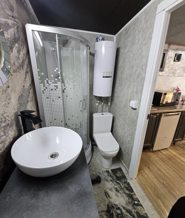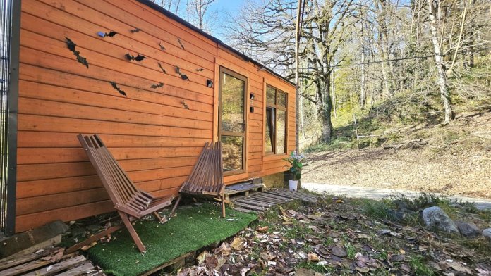 Наши дома - это новые, теплые и уютные помещения, оснащенные всем необходимым для комфортного проживания. В каждом доме есть мини-кухня с микроволновой печью и посудой, шкаф для одежды и удобный двуспальный раскладной диван. В ванной комнате Вас ждут душевая кабина, унитаз с микролифтом и стиральная машин.