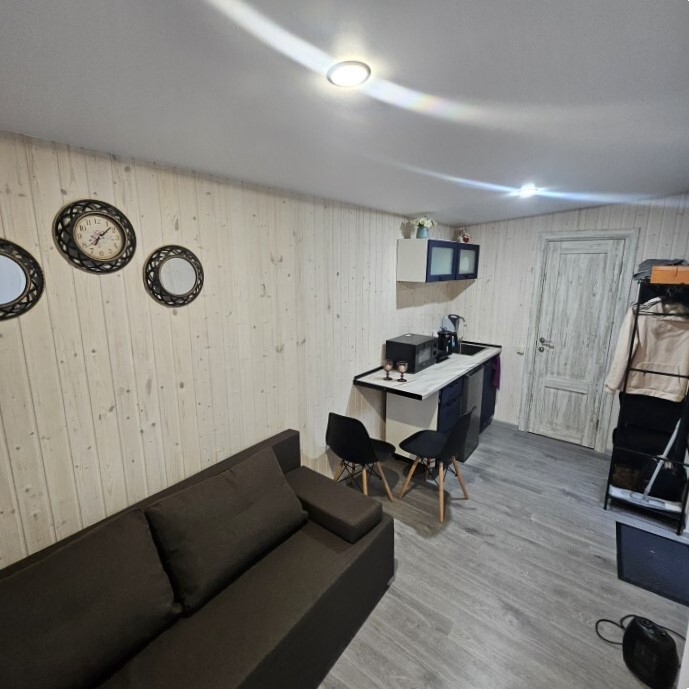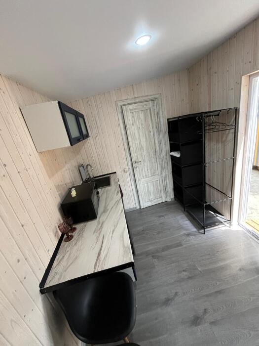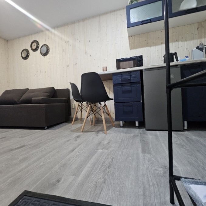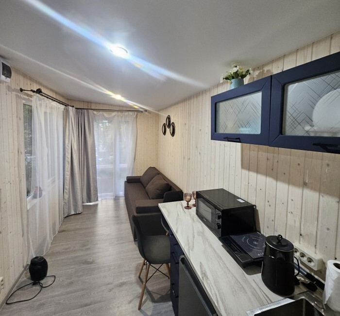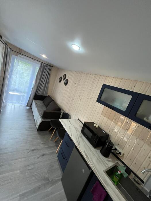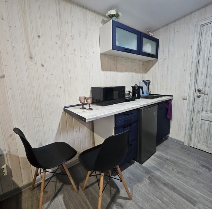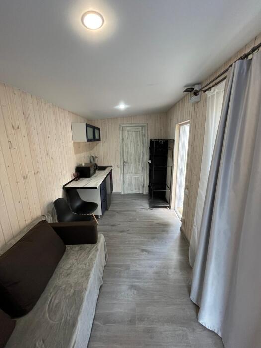 Наши дома - это новые, теплые и уютные помещения, оснащенные всем необходимым для комфортного проживания. В каждом доме есть мини-кухня с микроволновой печью и посудой, шкаф для одежды и удобный двуспальный раскладной диван. В ванной комнате Вас ждут душевая кабина, унитаз с микролифтом и стиральная машин.