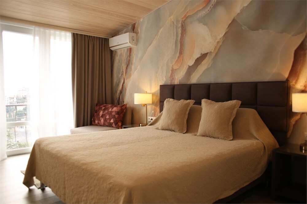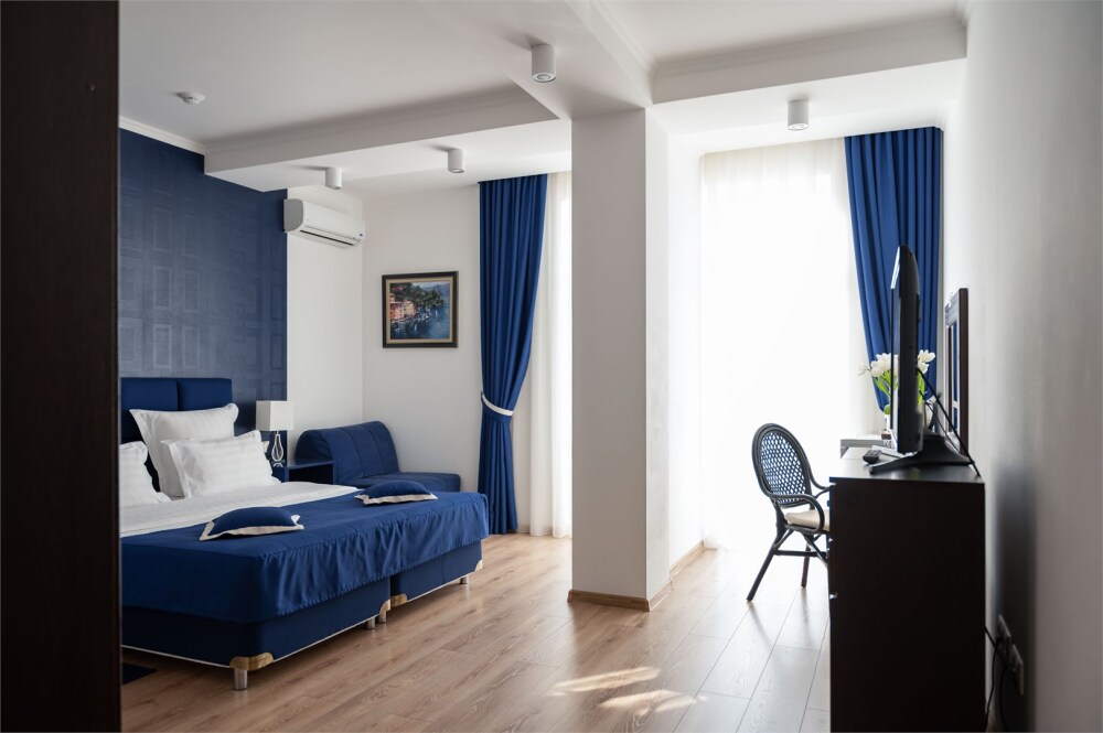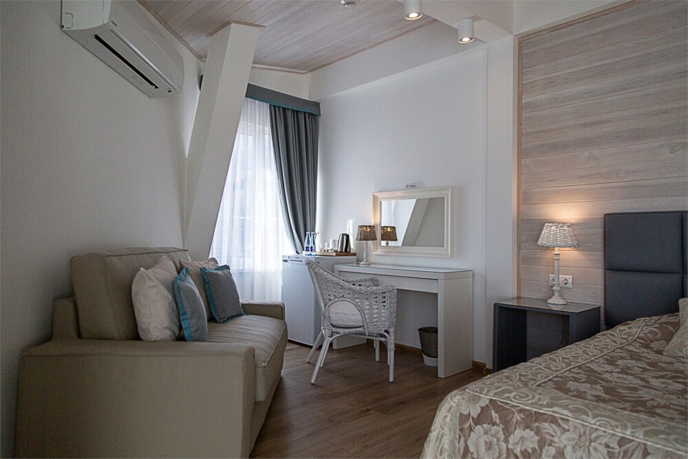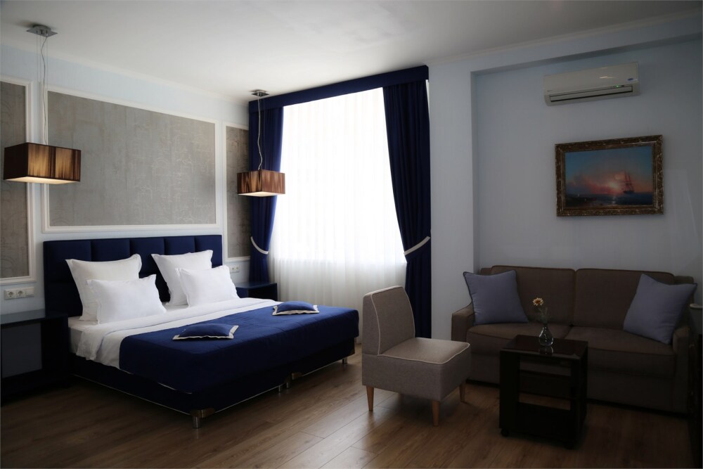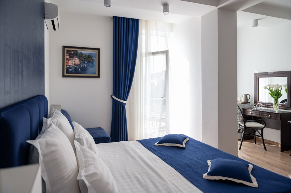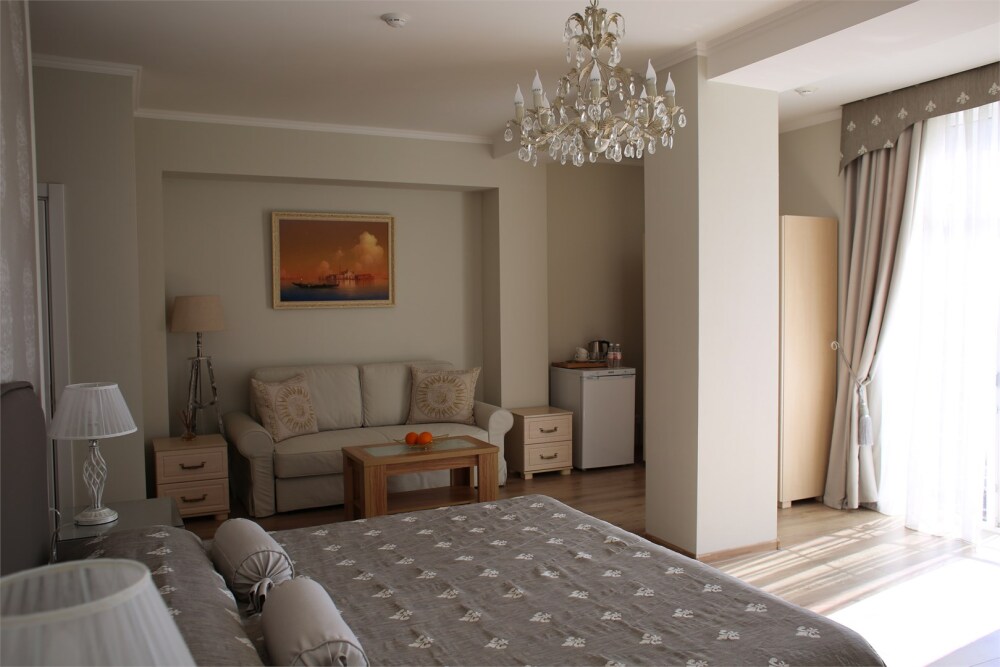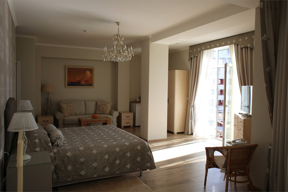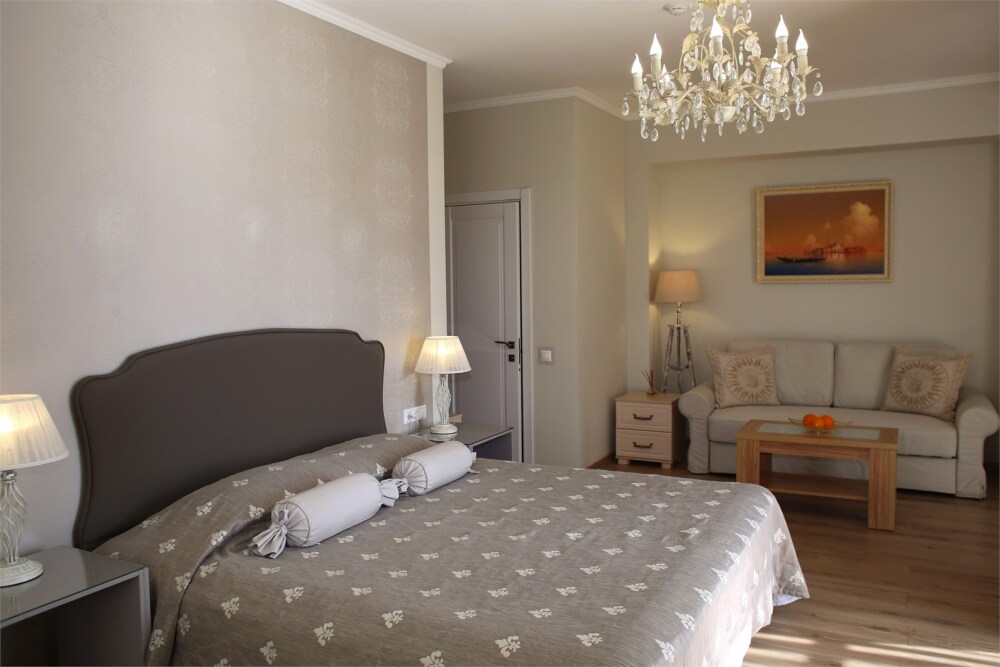 Элегантный и просторный однокомнатный номер площадью 39,5 кв. м. оформлен в классическом стиле и пастельных тонах, с видом на море и горы. Оборудован 1 двуспальной кроватью или 2 односпальными, дополнительным местом (диван), балконом и всем необходимым для комфортного отдыха.
