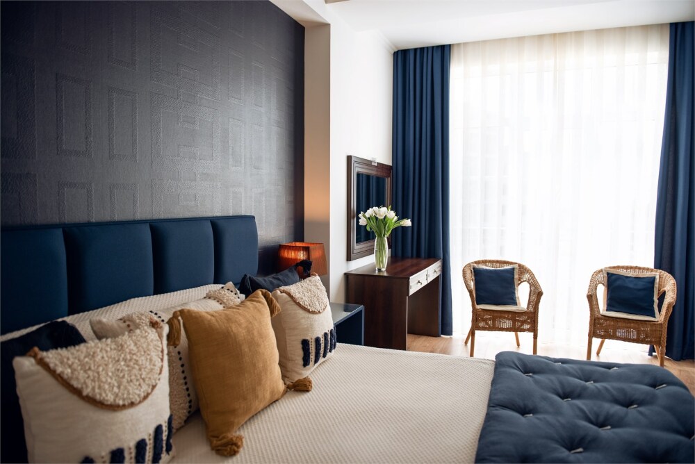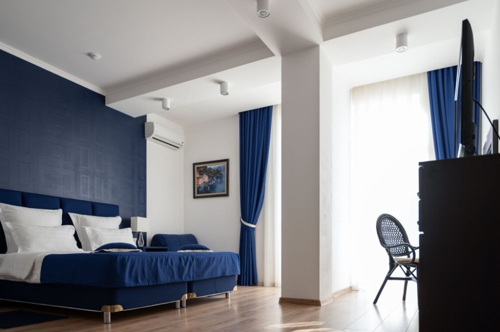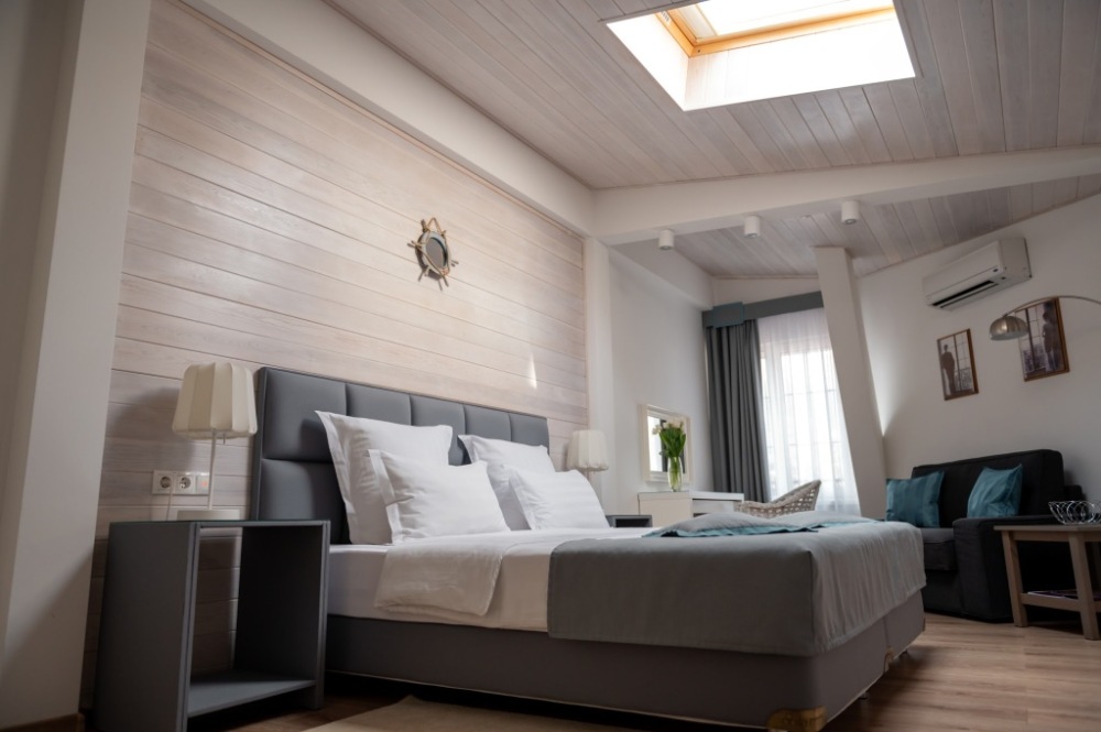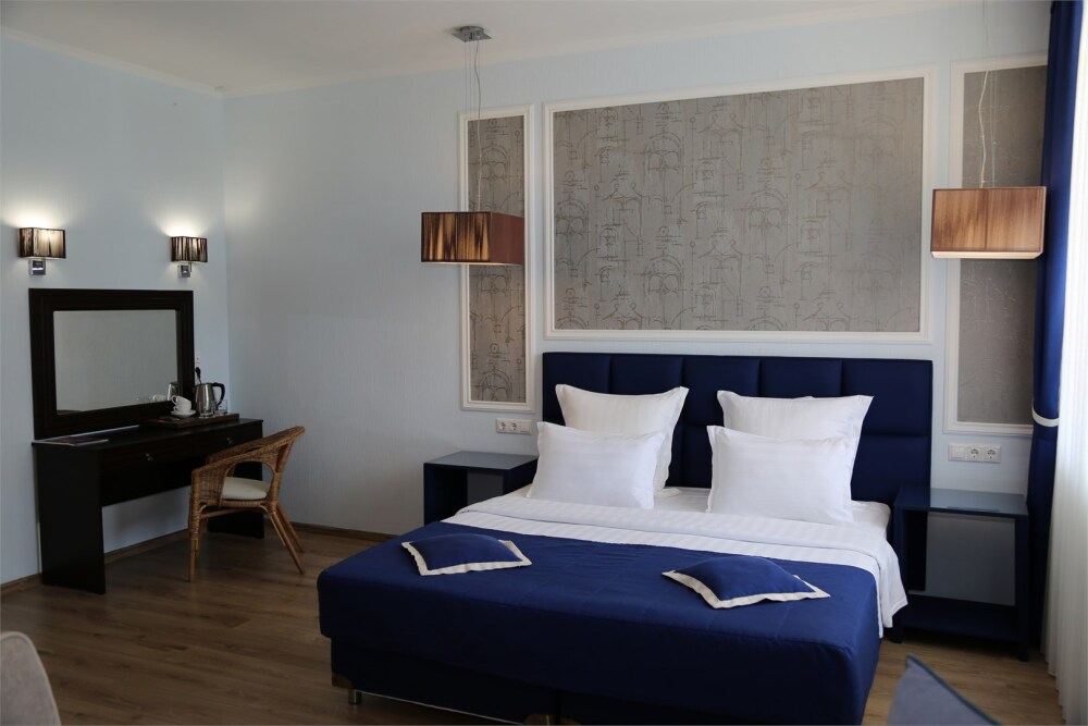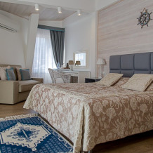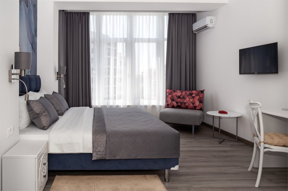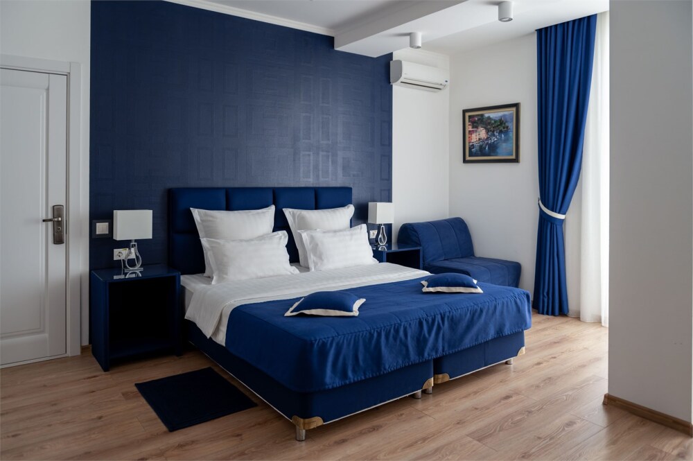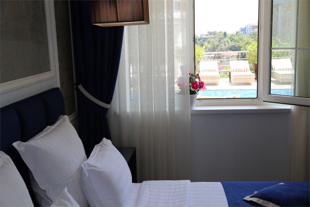 Элегантный и просторный однокомнатный номер площадью 39,5 кв. м. оформлен в классическом стиле и пастельных тонах, с видом на море и горы. Оборудован 1 двуспальной кроватью или 2 односпальными, дополнительным местом (диван), балконом и всем необходимым для комфортного отдыха.