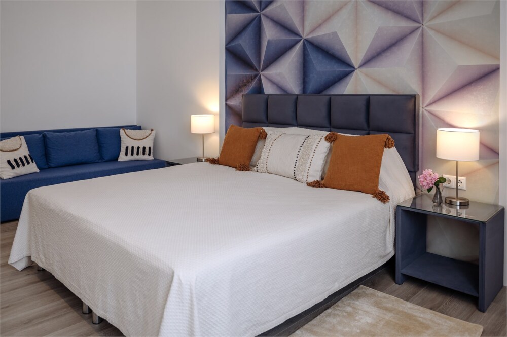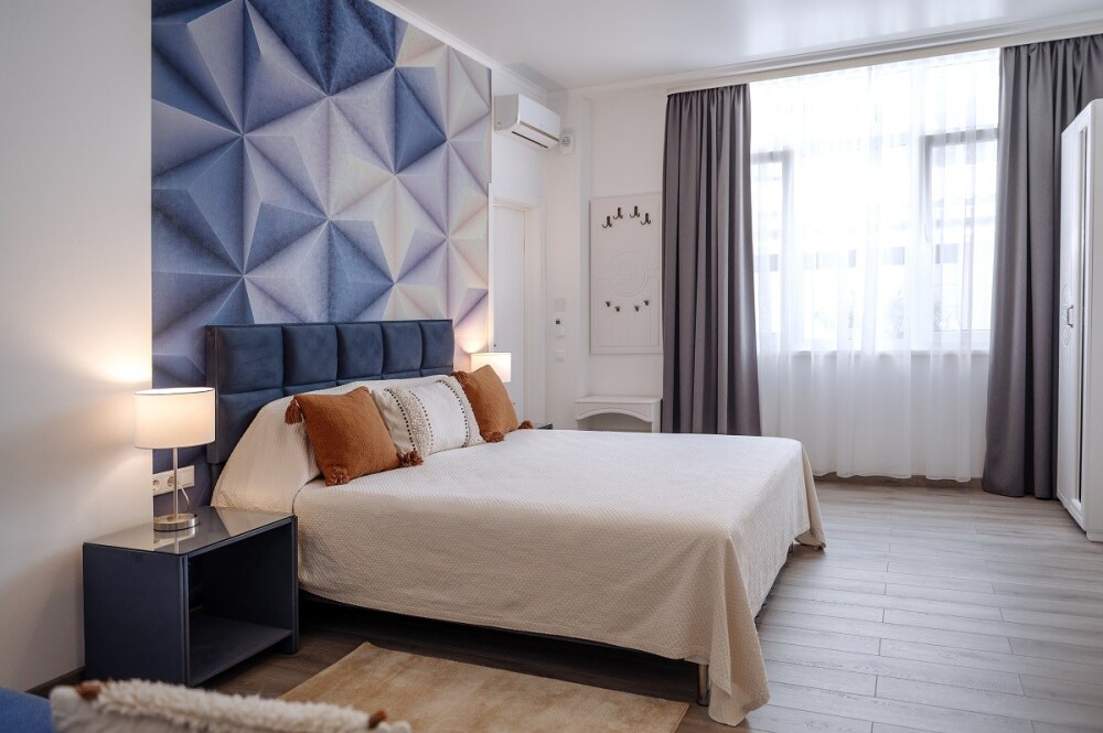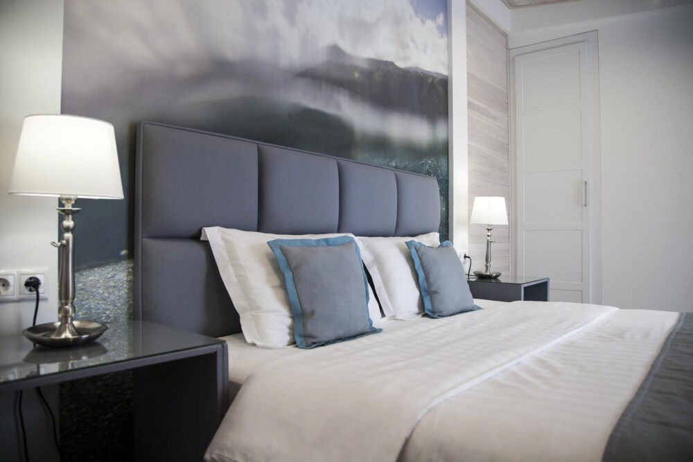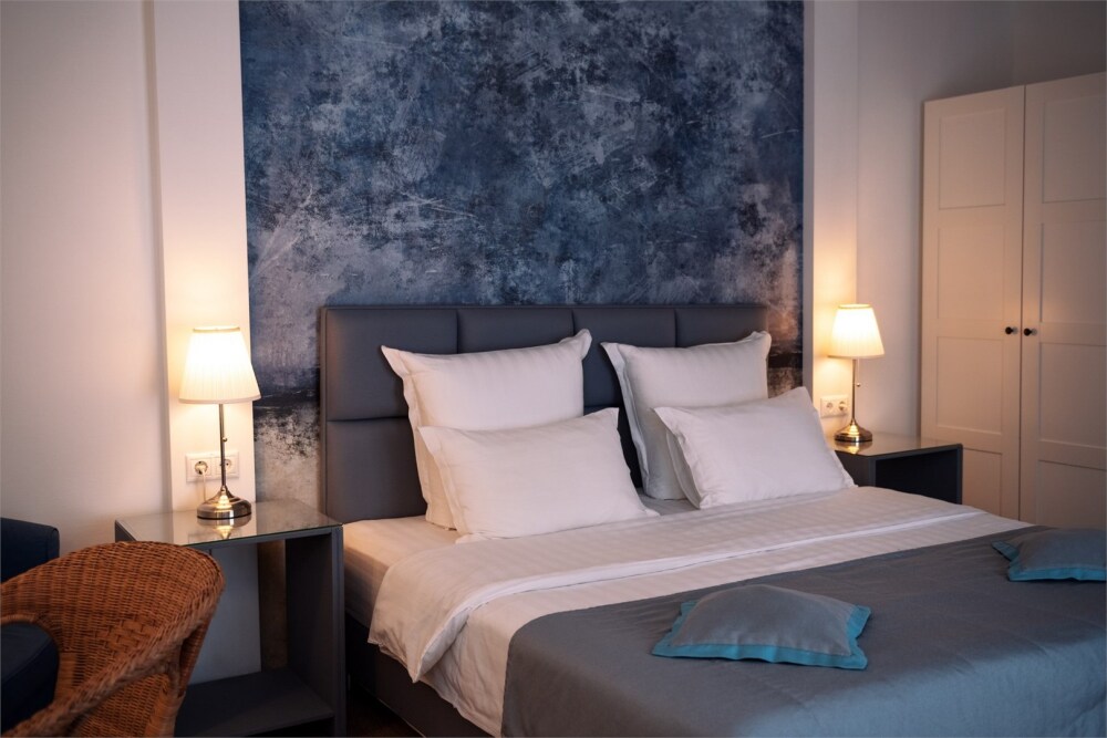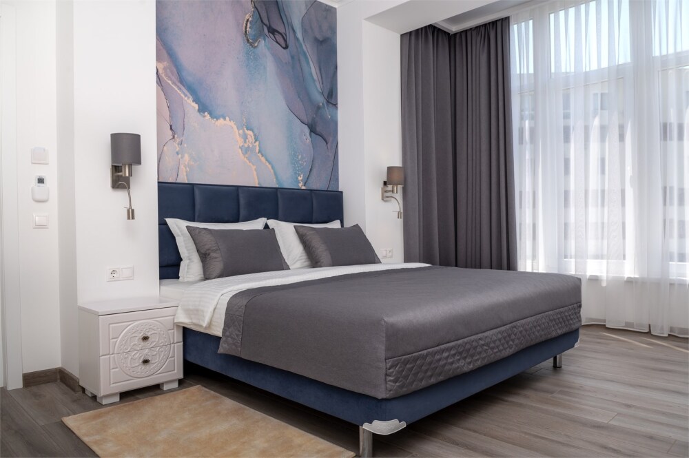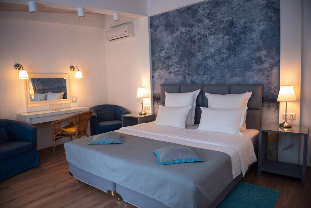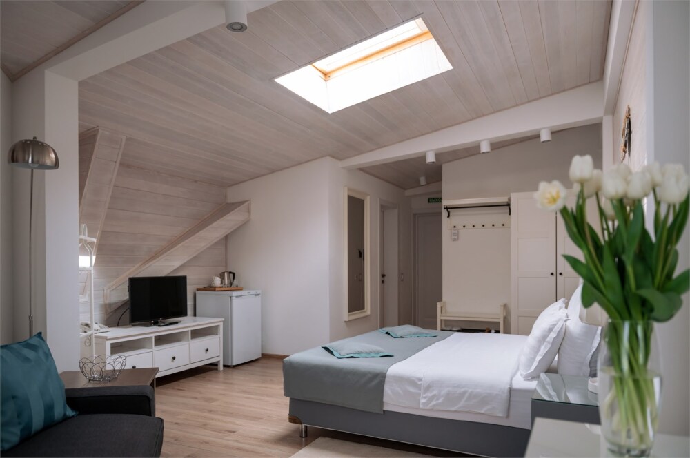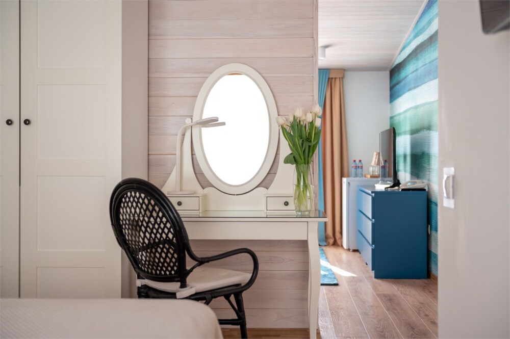 Элегантный и просторный однокомнатный номер площадью 39,5 кв. м. оформлен в классическом стиле и пастельных тонах, с видом на море и горы. Оборудован 1 двуспальной кроватью или 2 односпальными, дополнительным местом (диван), балконом и всем необходимым для комфортного отдыха.