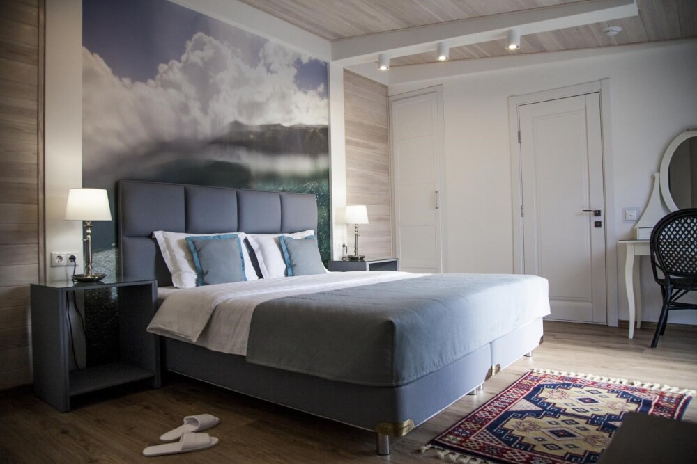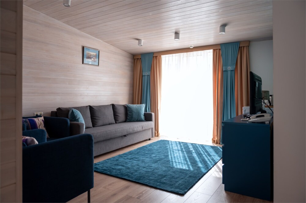 Большой комфортабельный 2-х комнатный номер 40,7 кв. м., с видом на горы, оборудован всем необходимым для отдыха, идеально подойдет для большой семьи. В номере: 2 спальни, 2 Балкона, 2 TV, Wi-Fi. По запросу возможно установить детскую кроватку.