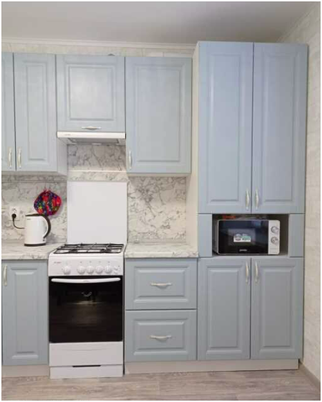 Кухня с необходимой посудой для приготовления, микроволновка, холодильник, электрический чайник.