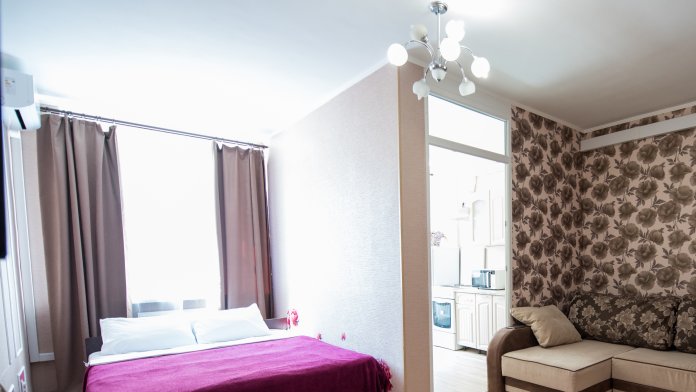 В квартире имеется большая двуспальная кровать, а также 2 удобных дивана, которые легко трансформируются в дополнительные спальные места. Таким образом, здесь с комфортом могут разместиться до 5 человек.