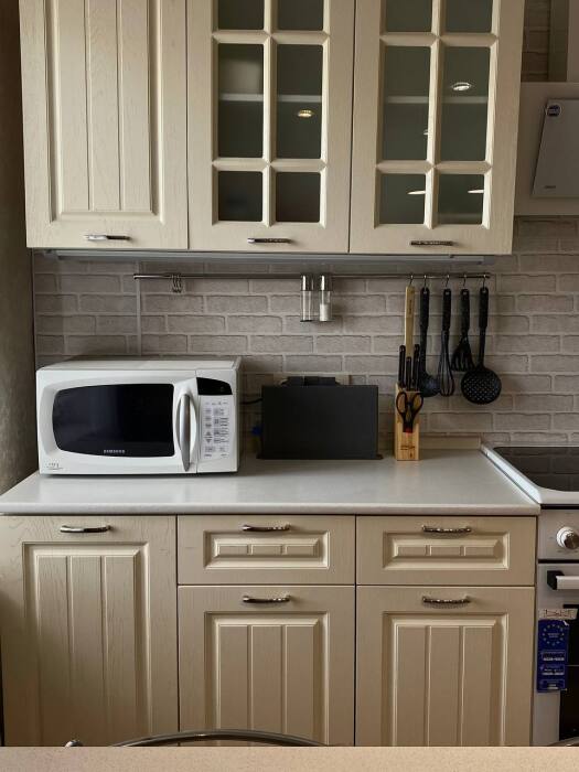 Кухня с необходимой посудой для приготовления, микроволновка, холодильник, электрический чайник