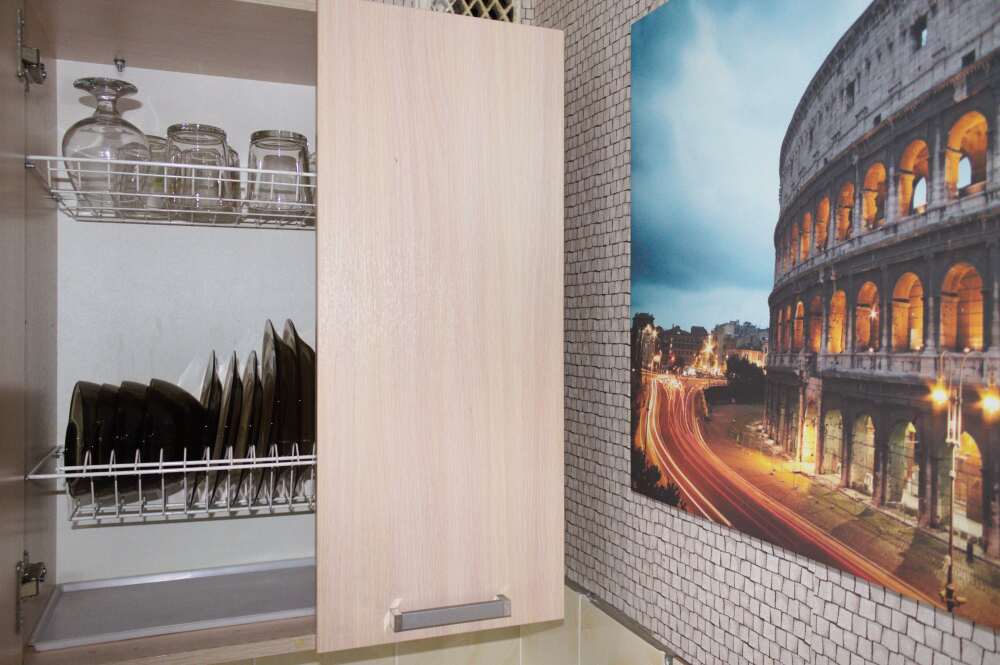 Кухня с необходимой посудой для приготовления, микроволновка, холодильник, электрический чайник.