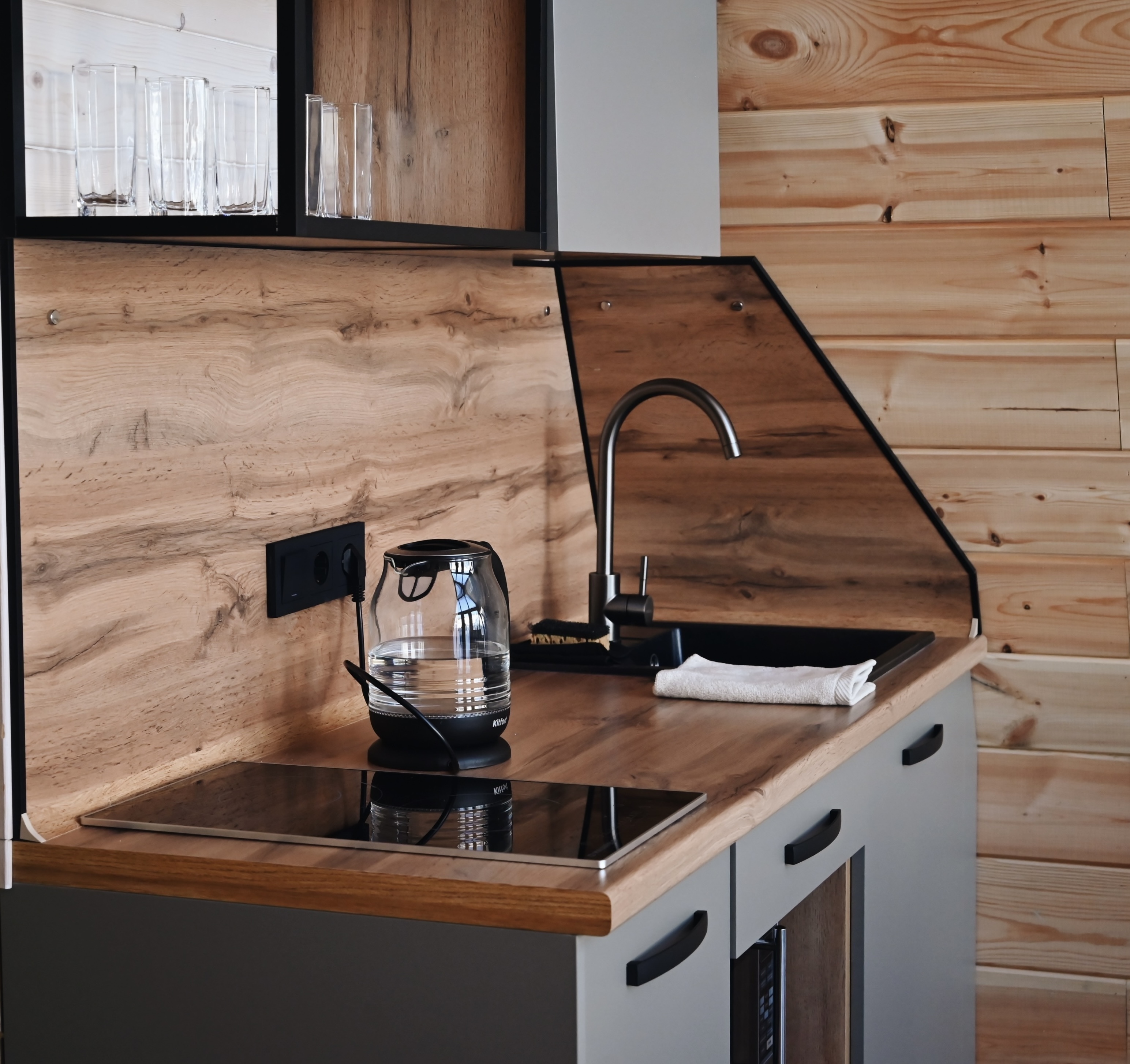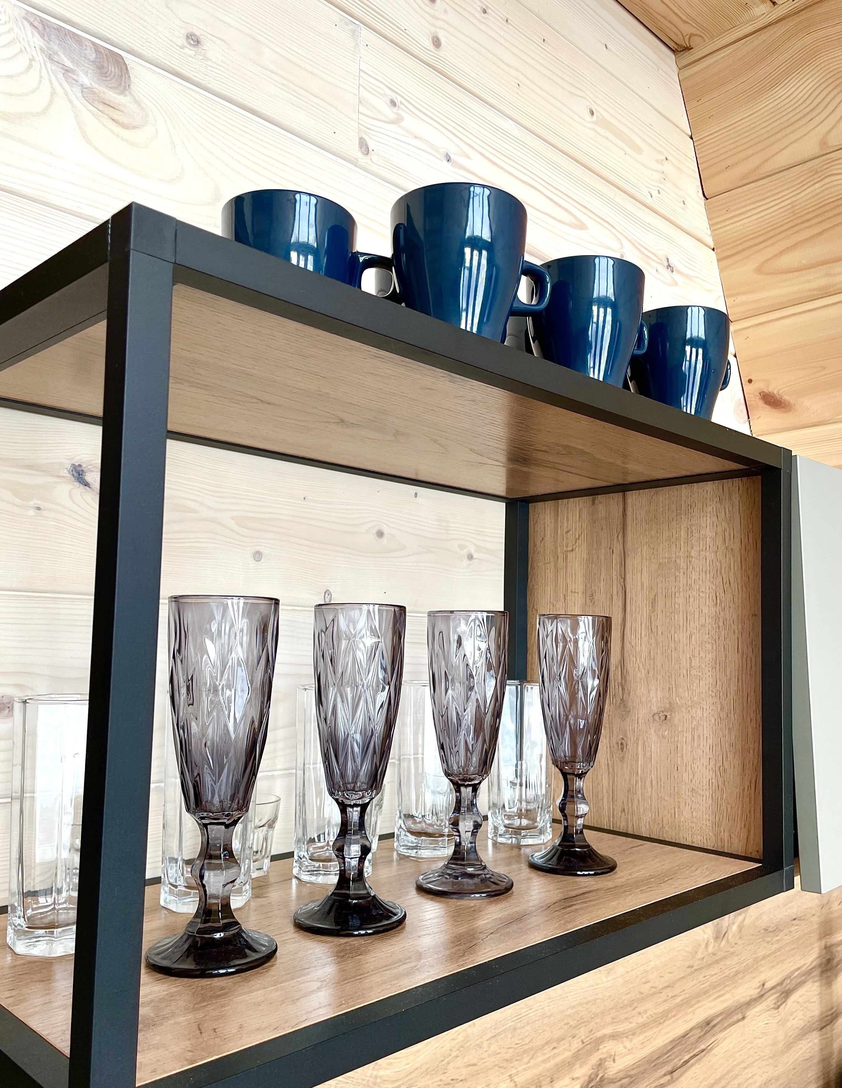 1 этаж: современная кухня, обеденная зона, гостиная с раскладывающимся диваном, санузел, спальня с двуспальной кроватью.
