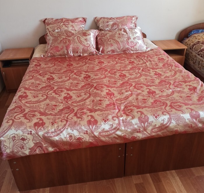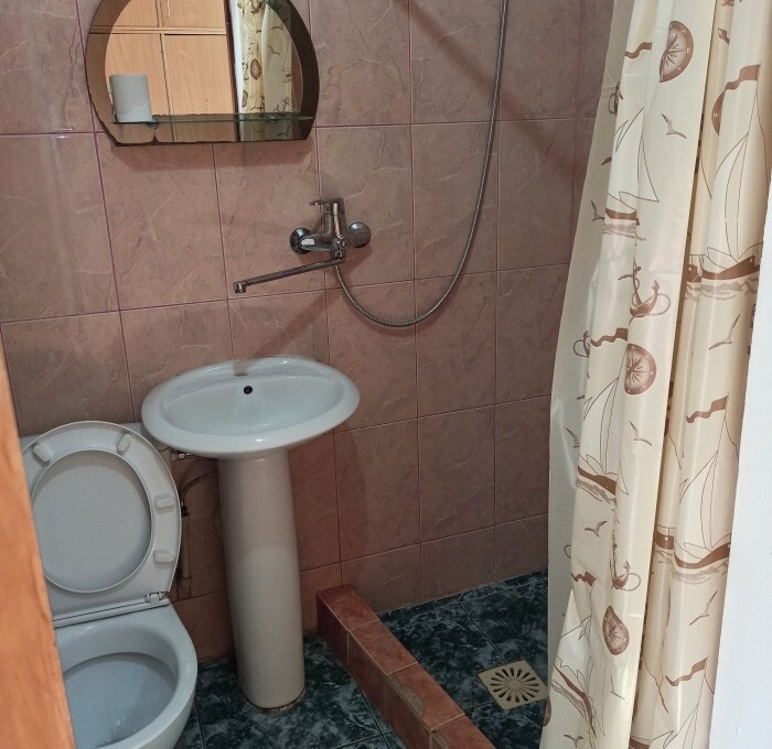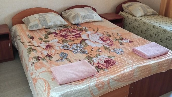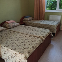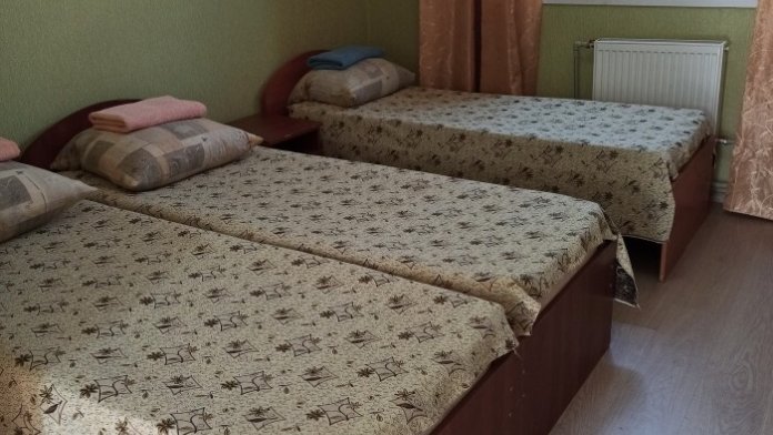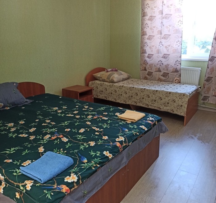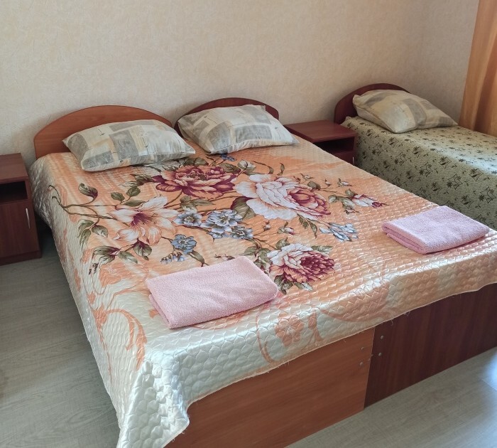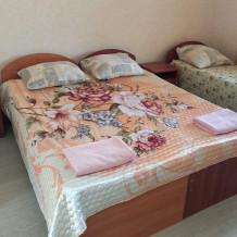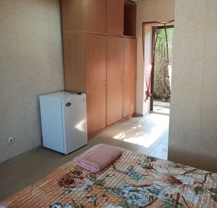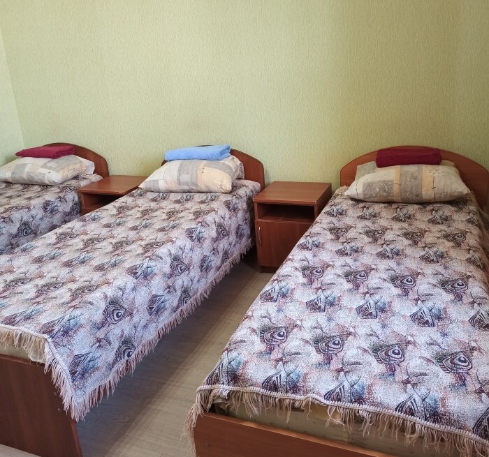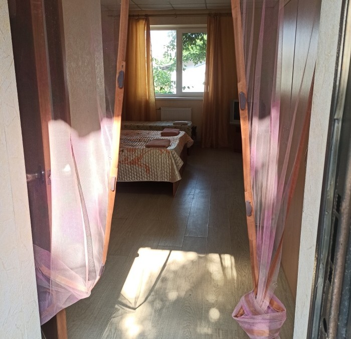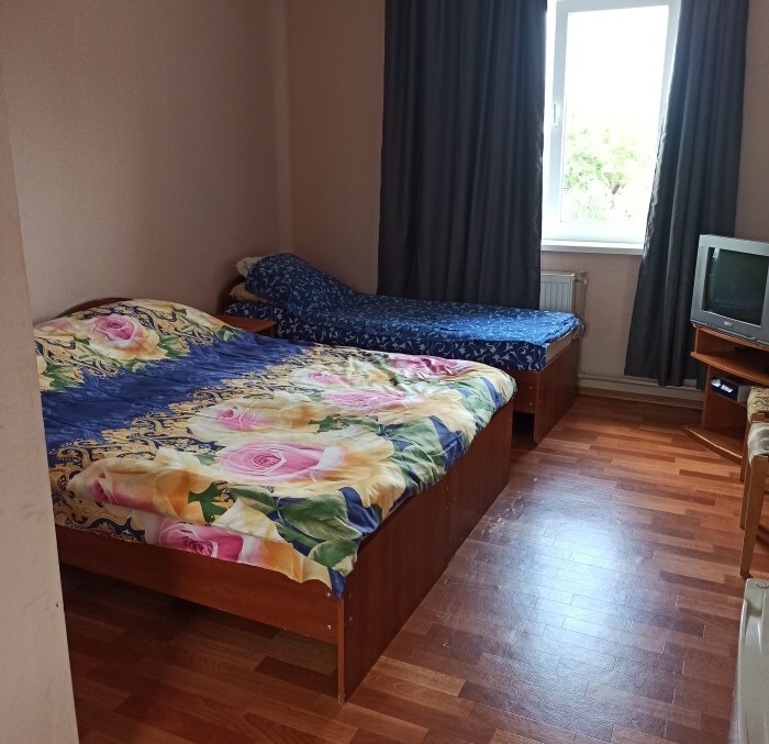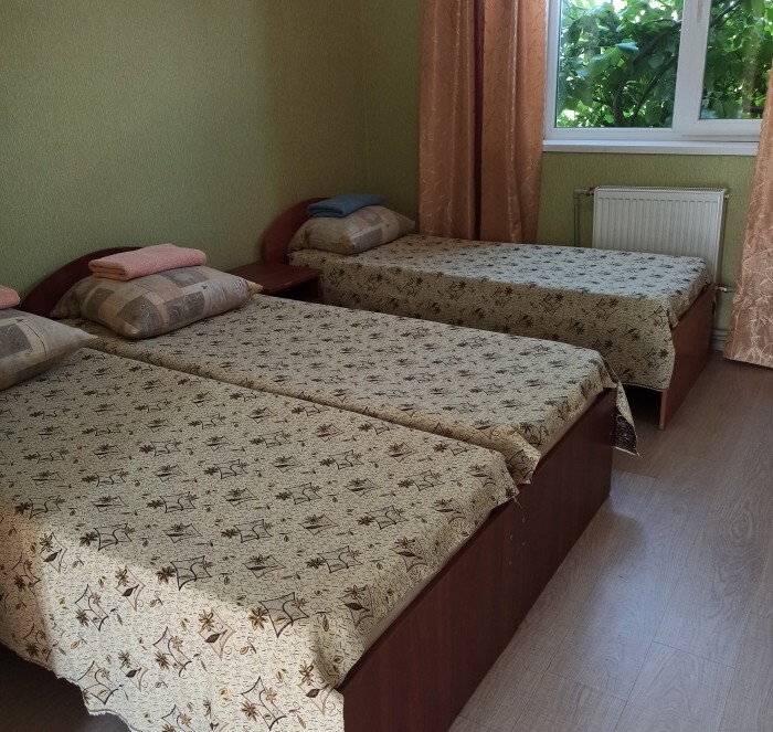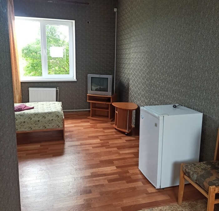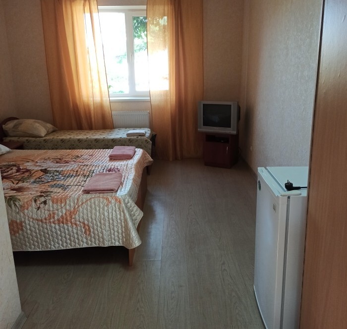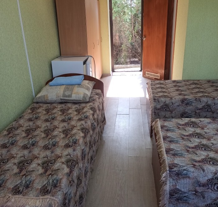 Номера «Стандарт», окно выходит на Восточную сторону, в номере прохладно,т.к первый этаж зелень укрывает от солнца. В комнате: санузел, тумбочка, шкаф, трюмо, ТВ, холодильник, Wi-Fi, 3 кровати.