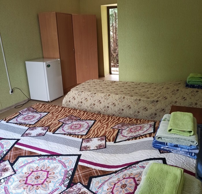 Номера «Стандарт»,окно выходит на Восточную сторону, в комнате прохладно, есть санузел, тумбочка, шкаф, трюмо, ТВ, холодильник, Wi-Fi, 4 кровати.