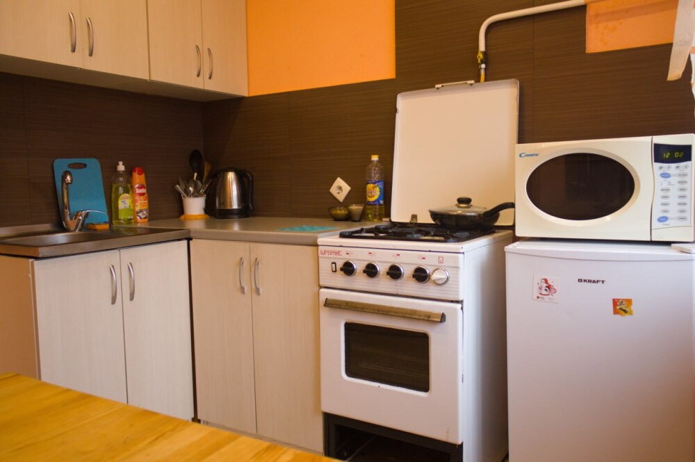 Кухня с необходимой посудой для приготовления, микроволновка, холодильник, электрический чайник.