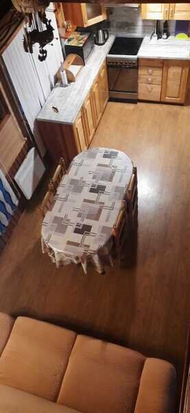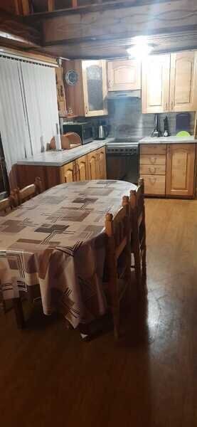 - зал-кухня 36 м кв второй свет, диван, тв триколор, печь камин, обеденный стол, стулья, кухня, эл плита, микроволновая, эл чайник, посуда;