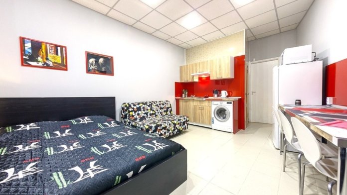 В квартире студии удобная двуспальная кровать, двуспальный диван, телевизор, полностью оборудованная зона мини-кухни со всей необходимой посудой и техникой, совмещенный санузел с душем.