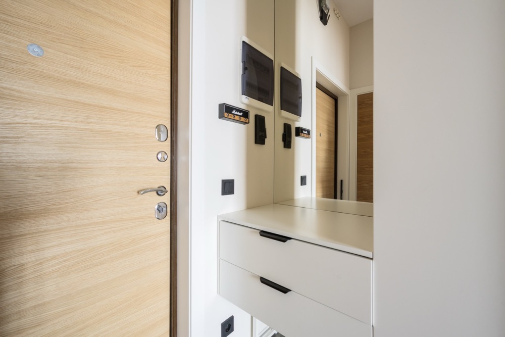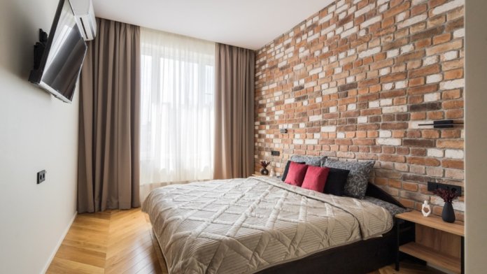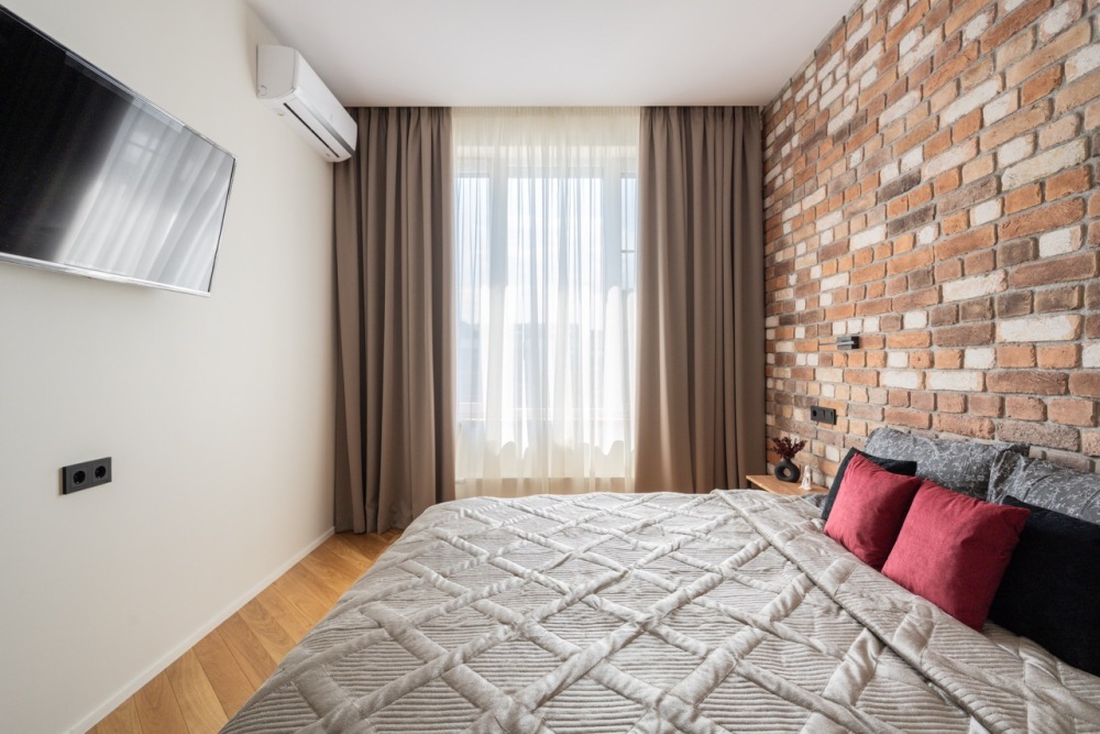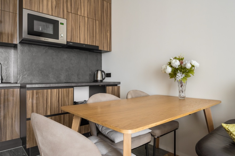 Спальня: двуспальная кровать ортопедическим матрасом, вместительный шкаф и телевизор. Кухня-гостиная: диван, стол, стулья, телевизор, кухонный гарнитур (плита, духовка, большой холодильник, свч).