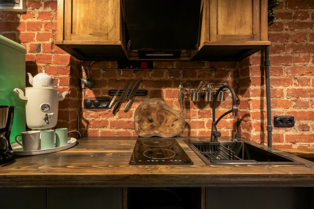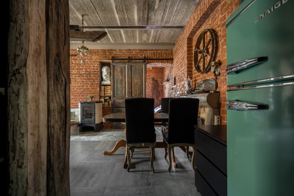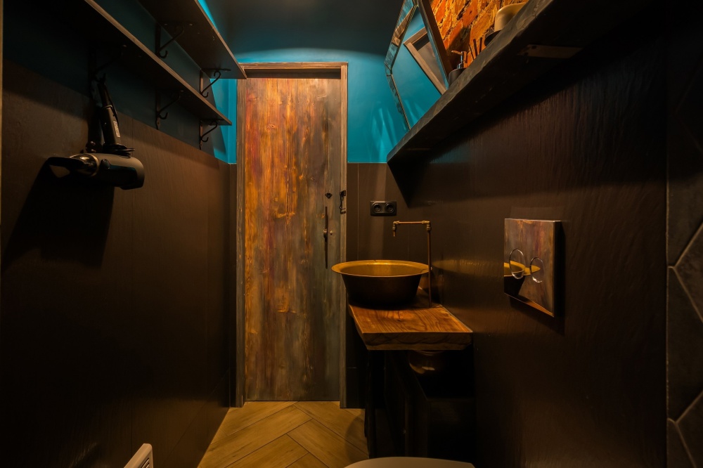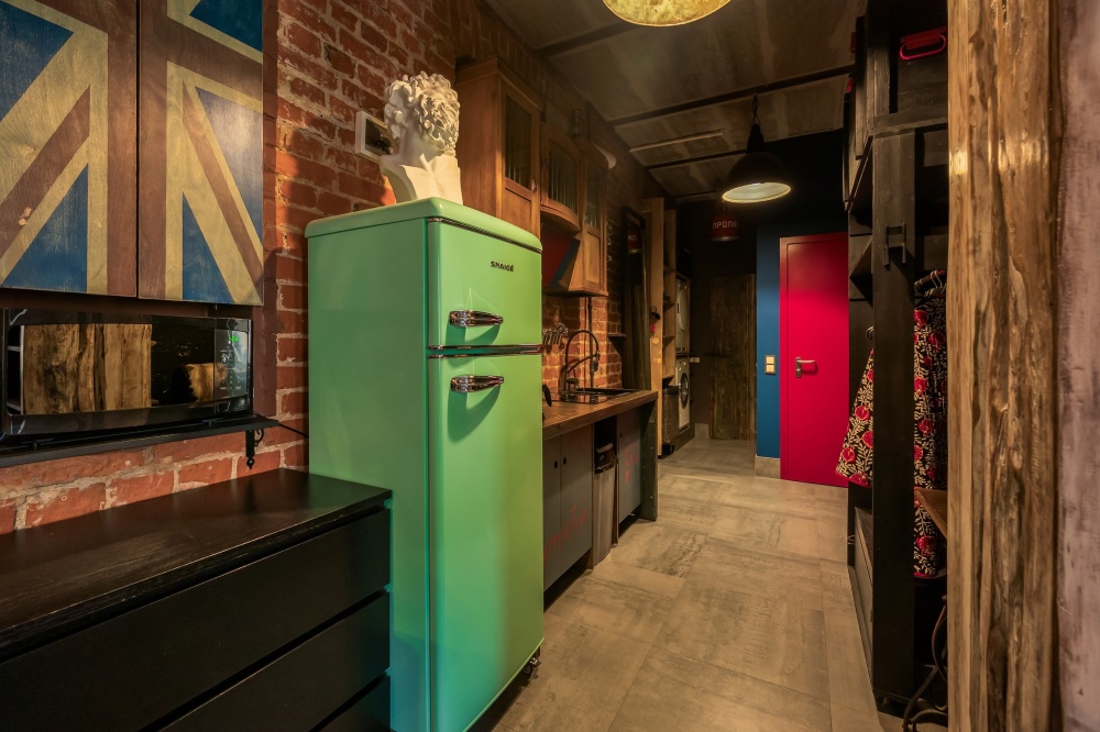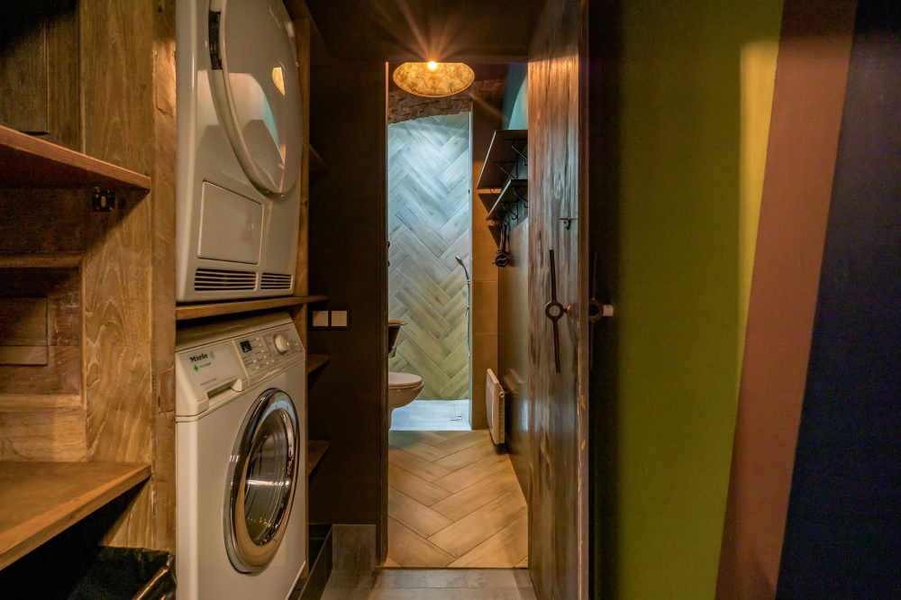 Кухня-столовая оборудована электрической плитой, холодильником, микроволновой печью, термопотом и кофеваркой. В зоне столовой располагается большой обеденный стол и стулья на 5 персон, зона отдыха с креслом, диваном, тв. Совмещенный санузел со всем необходимым: фен, стиральная машина, утюг.