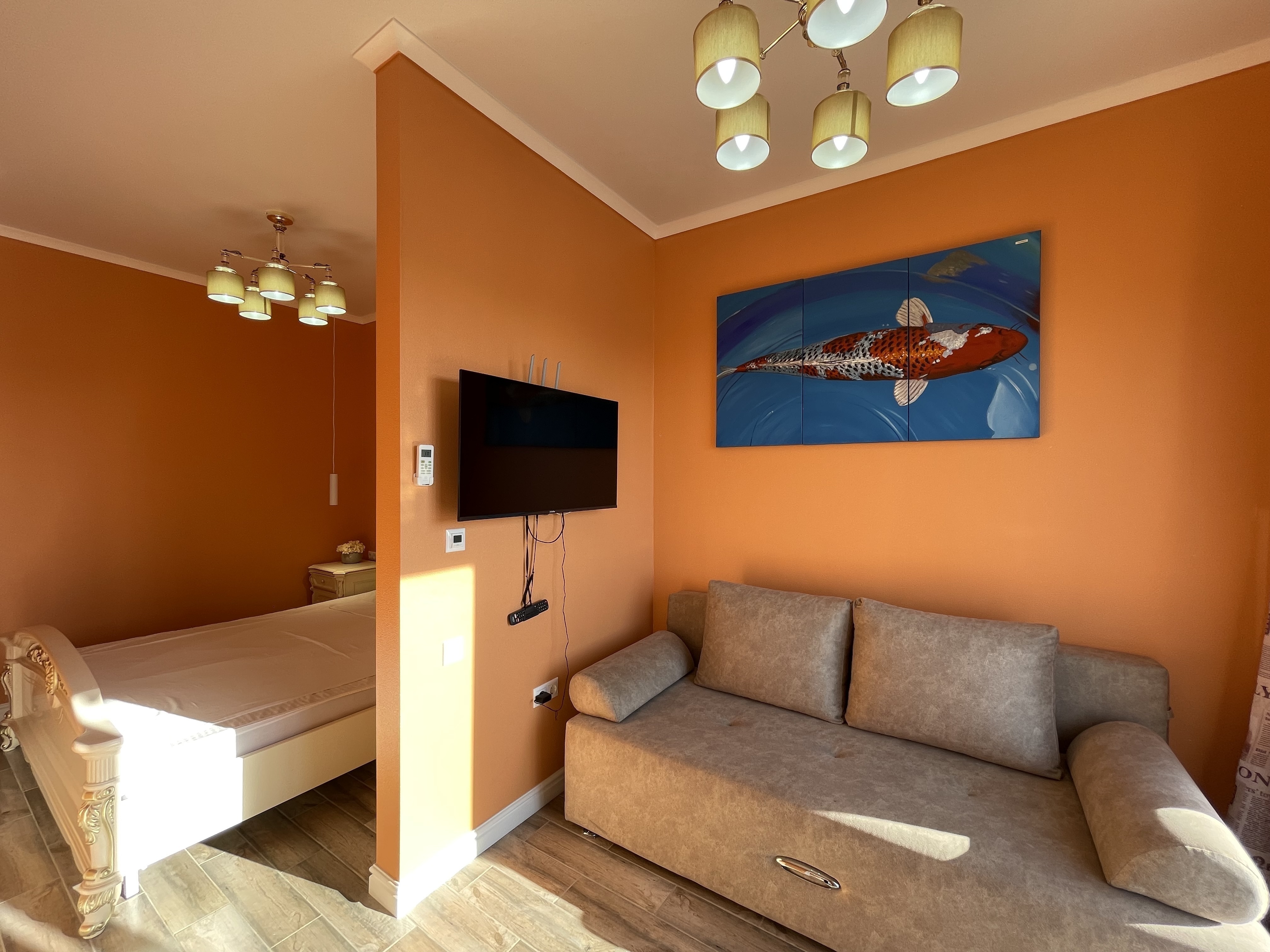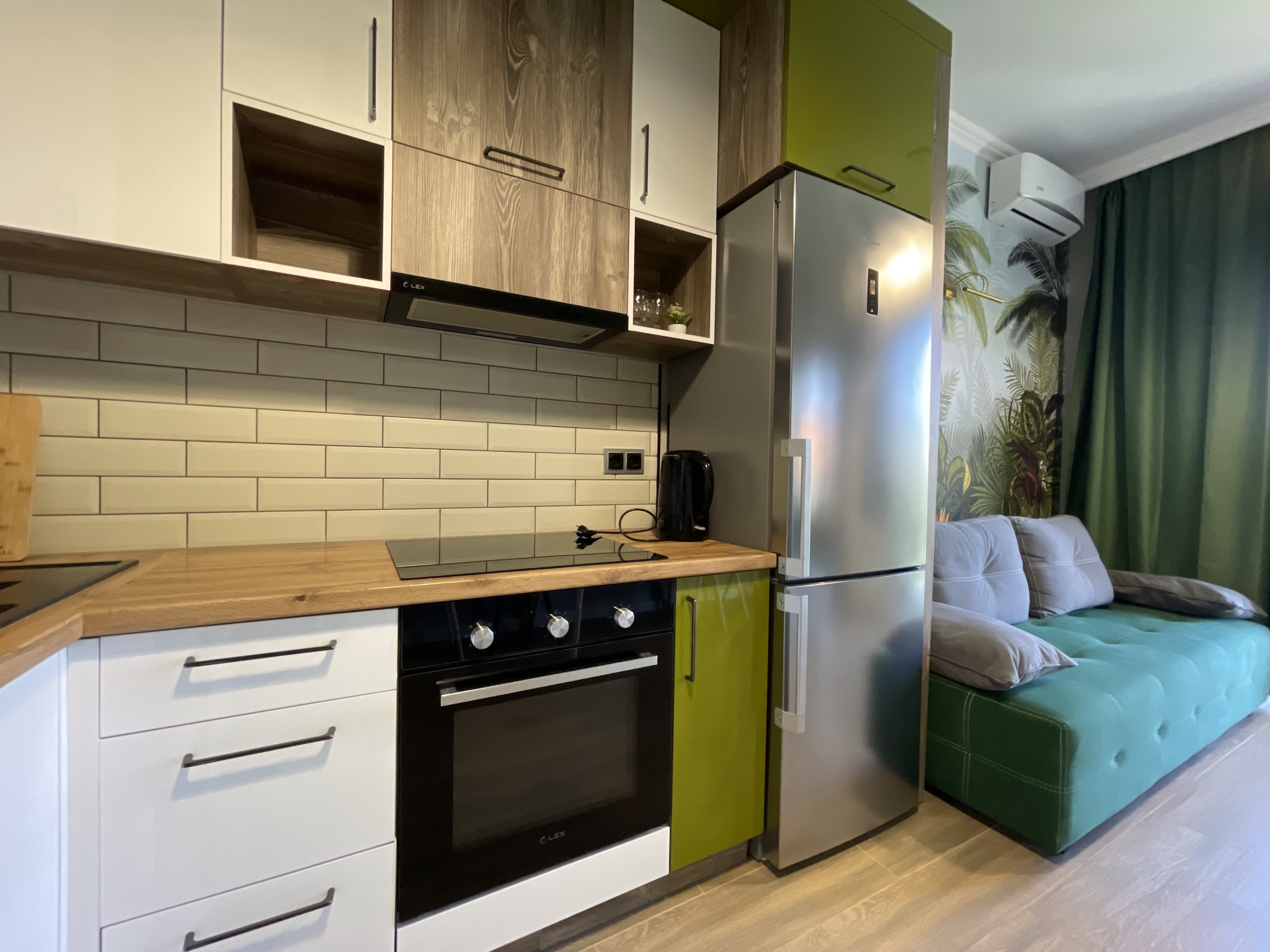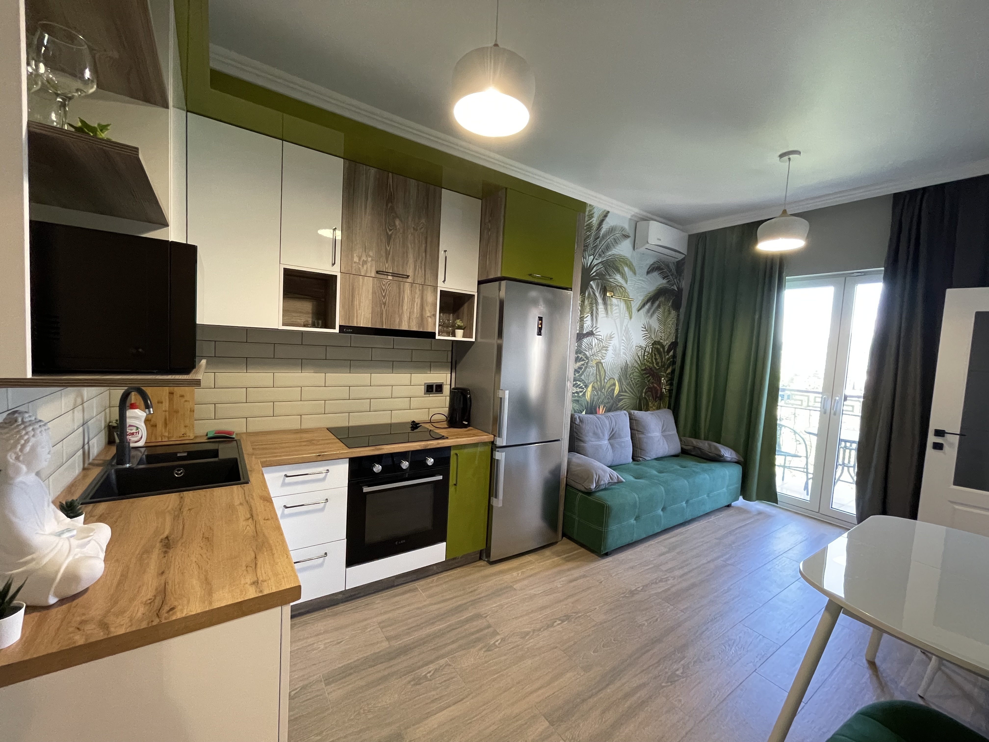 В квартире есть всё необходимое для проживания: холодильник, микроволновка, кухонная плита, свч печь, кондиционер, стиральная машина, Wi-Fi и телевидение.