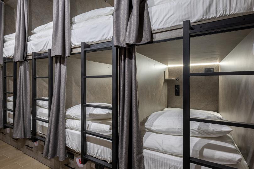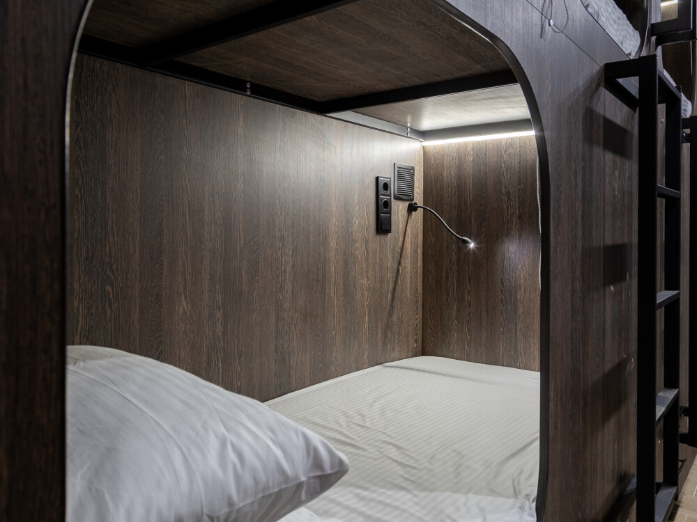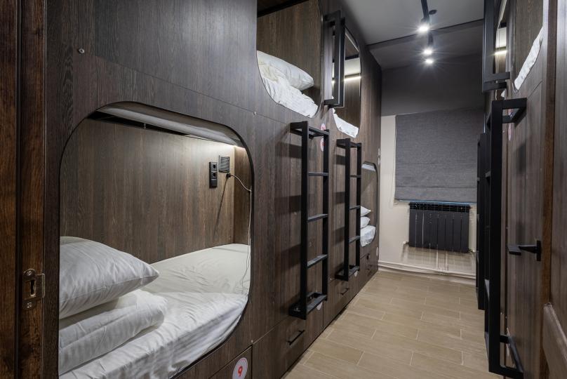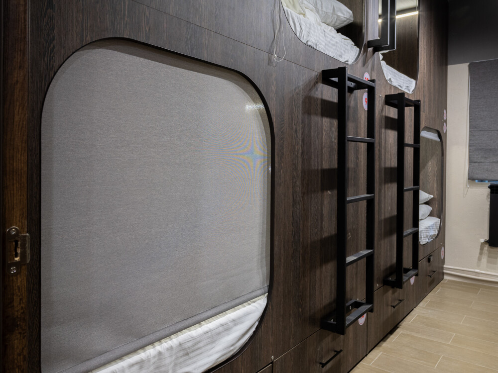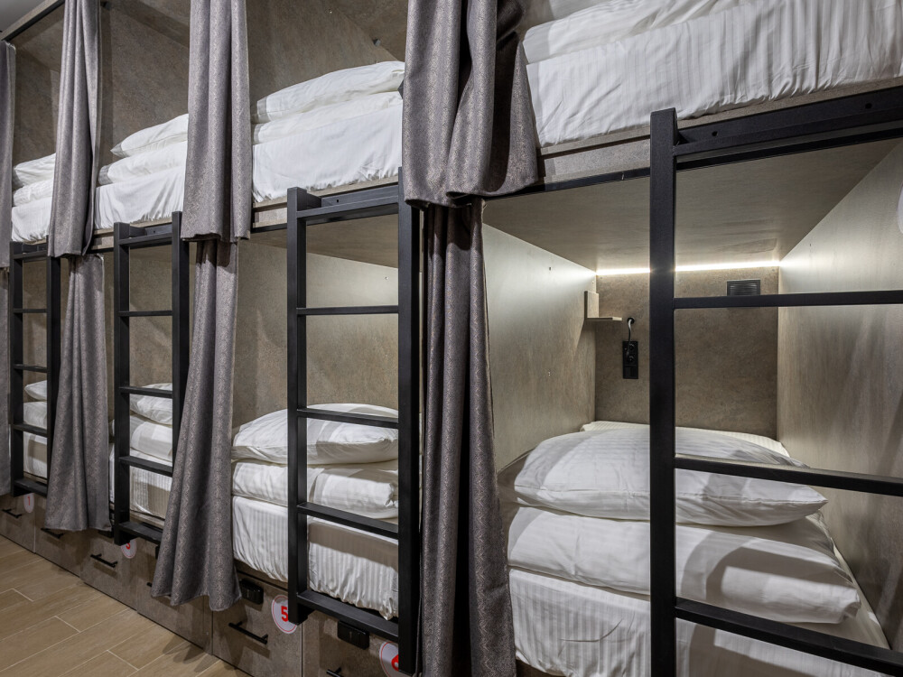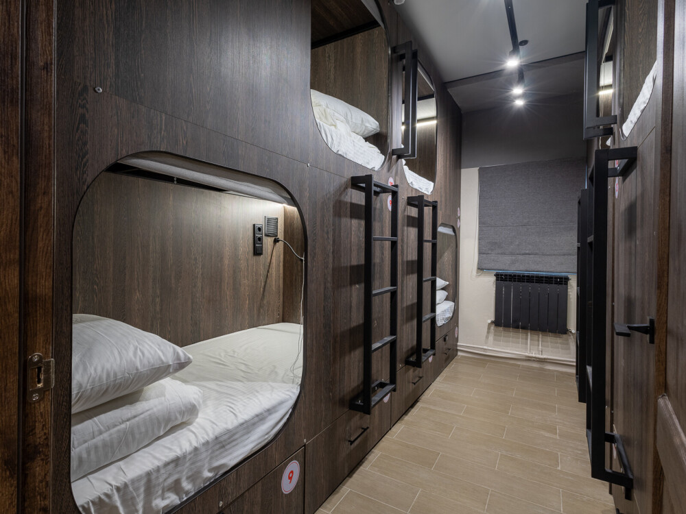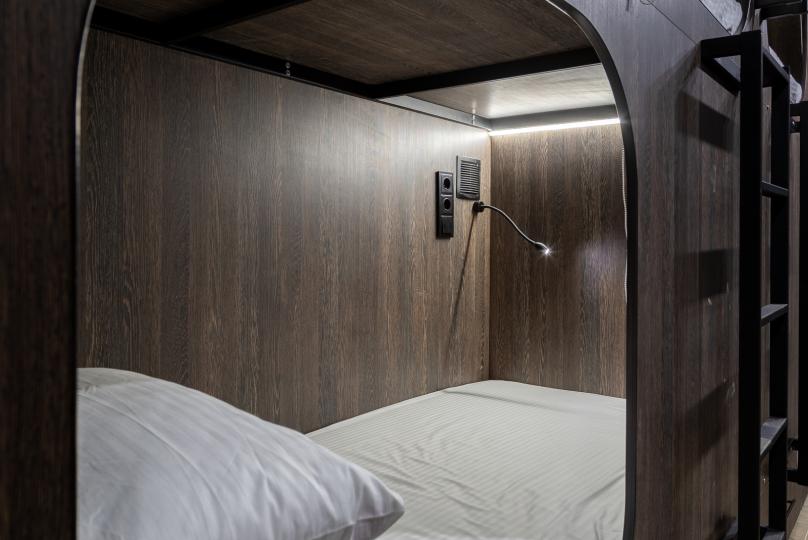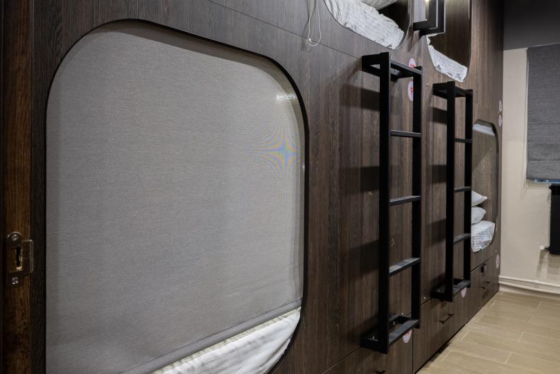 Восьмиместный номер с двухъярусными кроватями. Каждая кровать выполнена в формате капсулы, каждая капсула закрывается плотной шторкой, так же каждая капсула оснащена индивидуальным освещением, вентилятором, розеткой и бра на гибком шланге для чтения. В комнате есть кондиционер и окно.