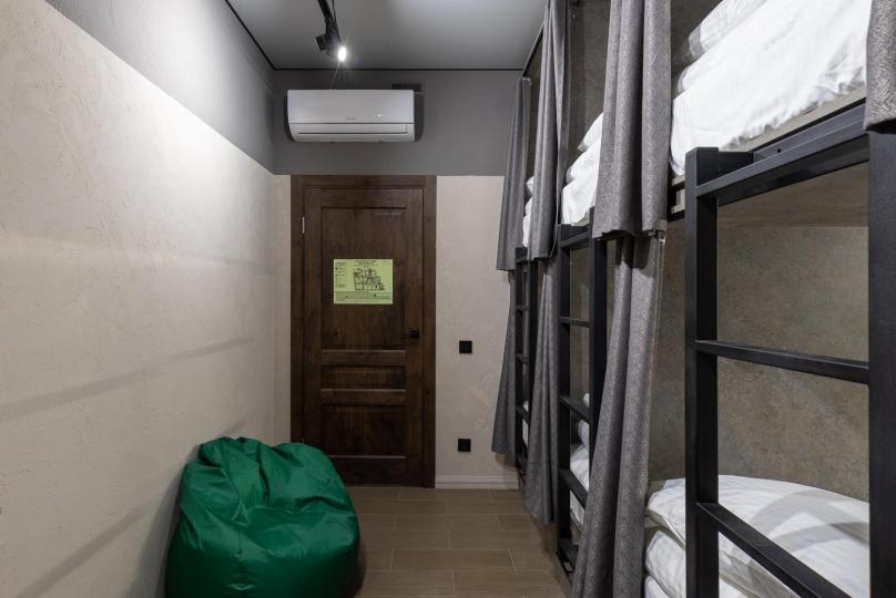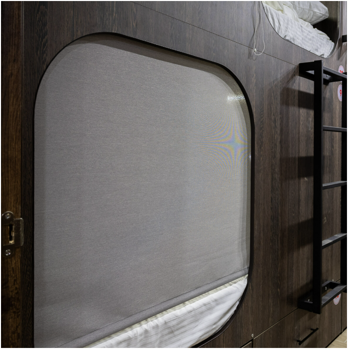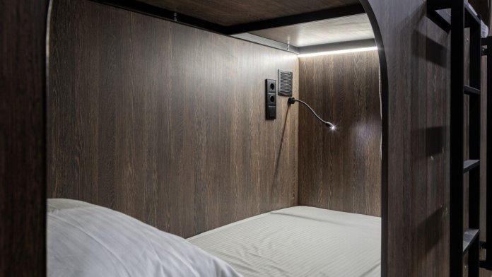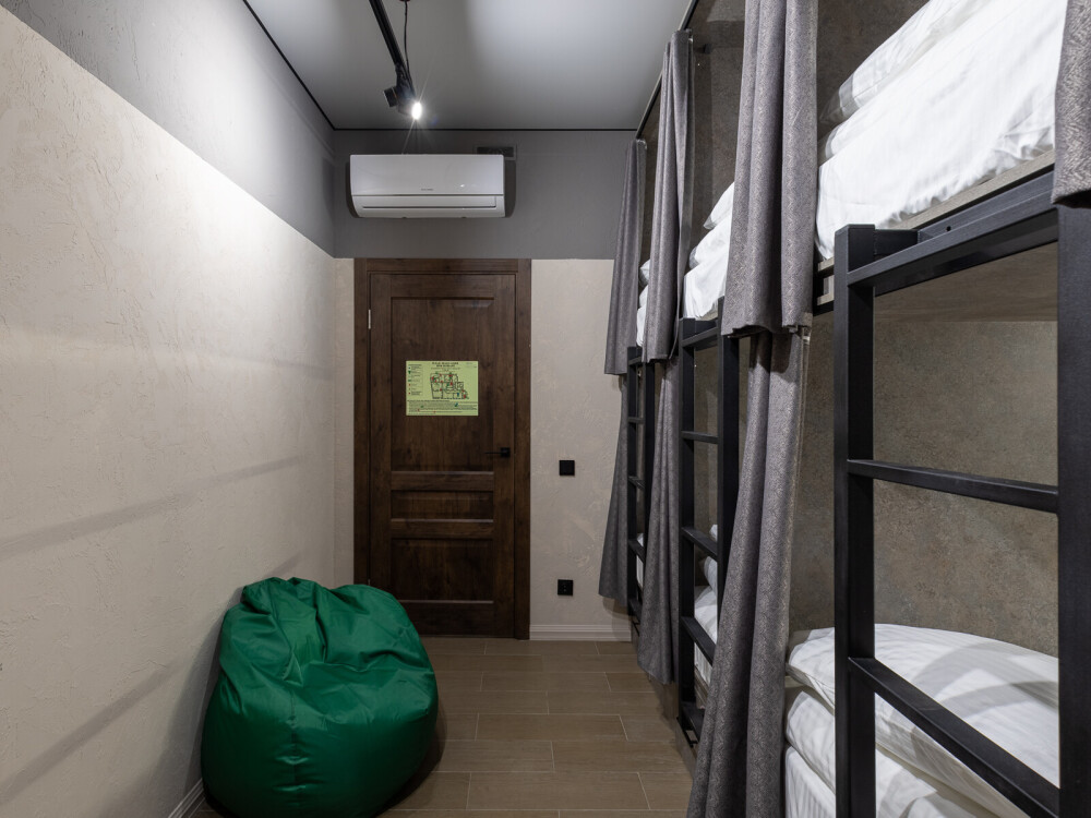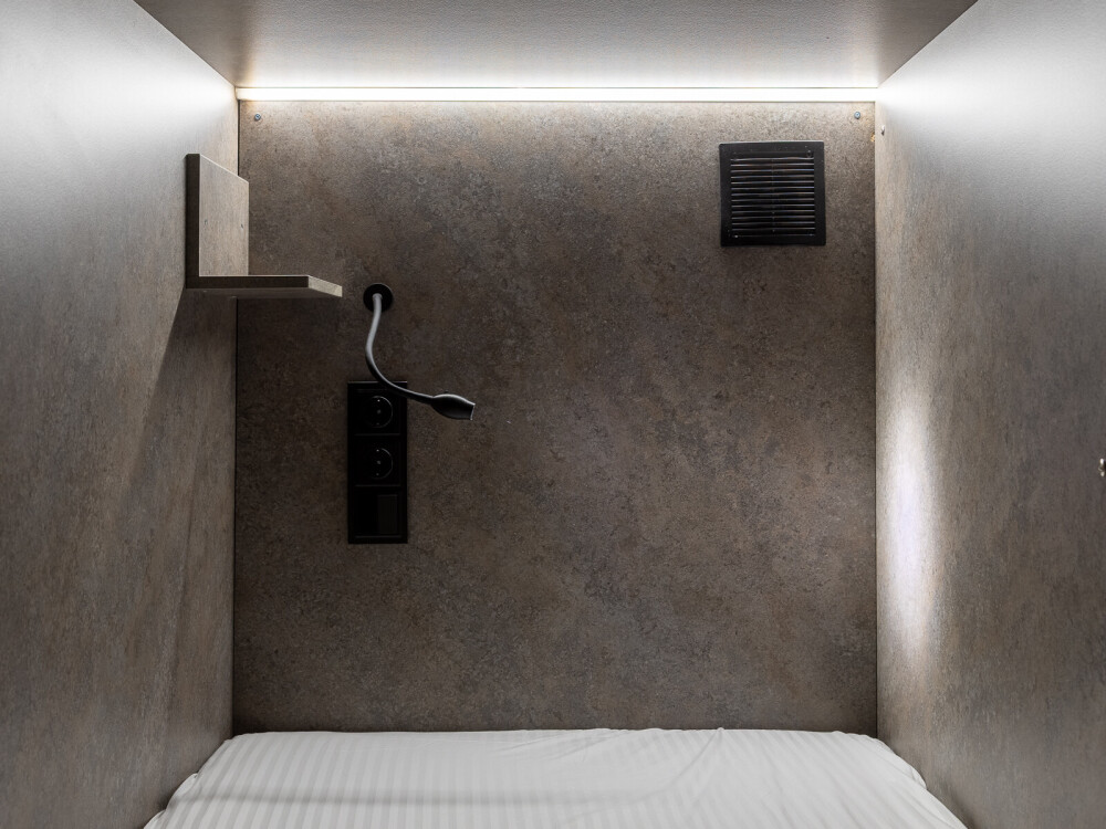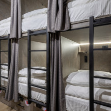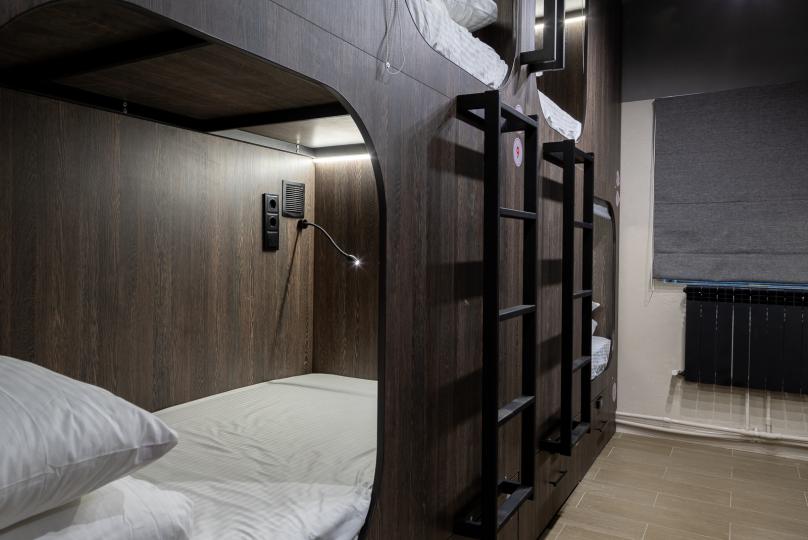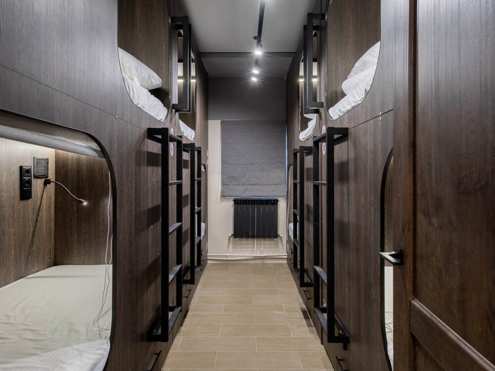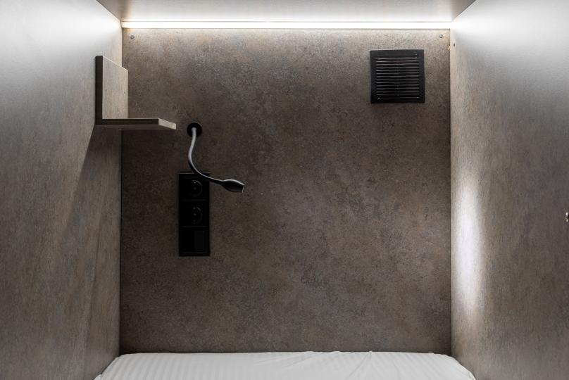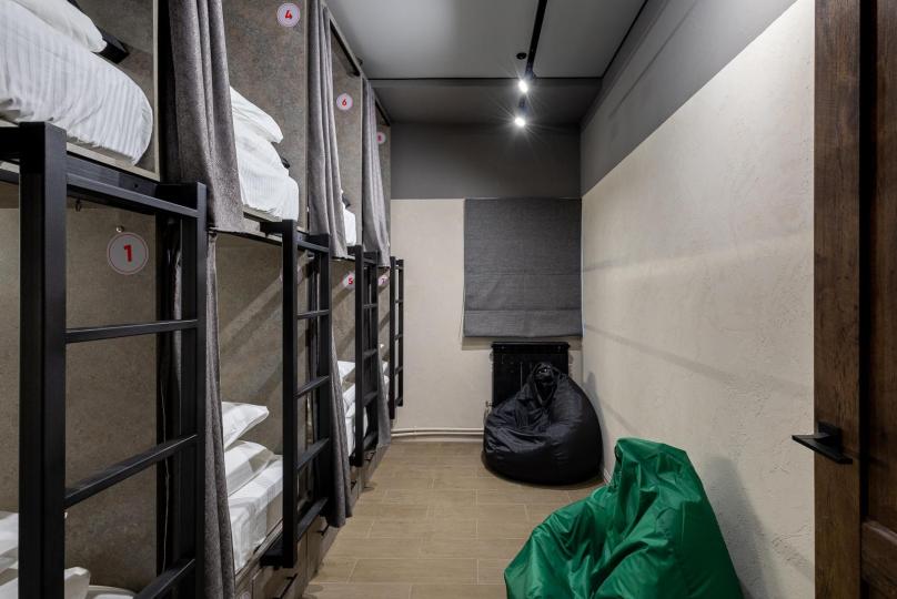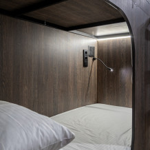Восьмиместный номер с двухъярусными кроватями. Каждая кровать выполнена в формате капсулы, каждая капсула закрывается плотной шторкой, так же каждая капсула оснащена индивидуальным освещением, вентилятором, розеткой и бра на гибком шланге для чтения. В комнате есть кондиционер и окно.