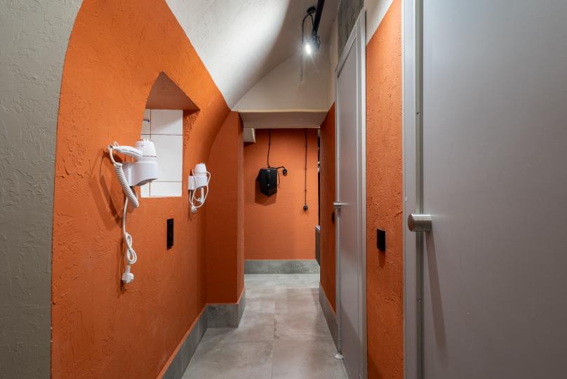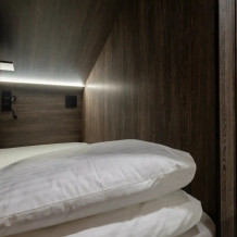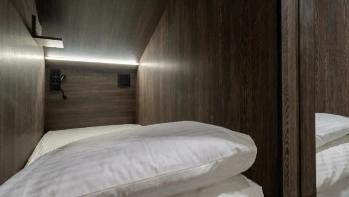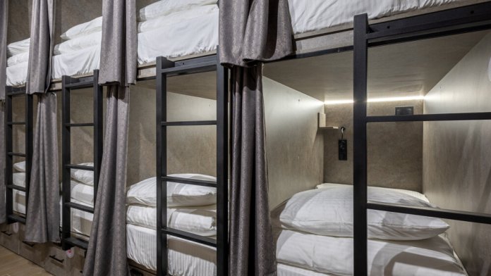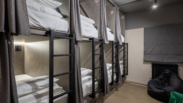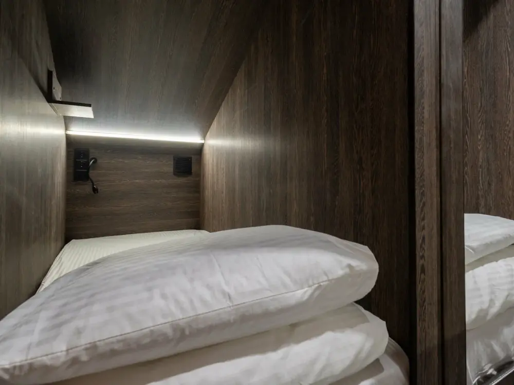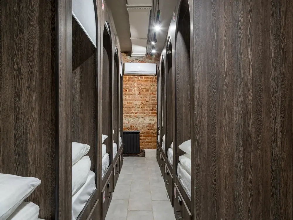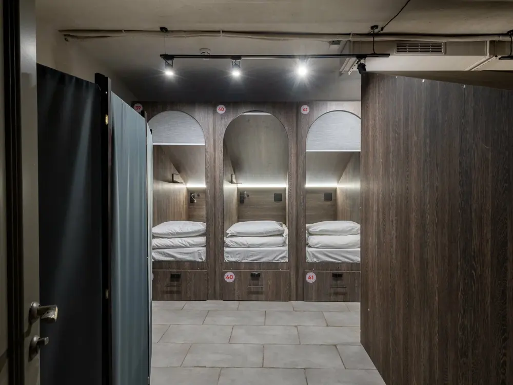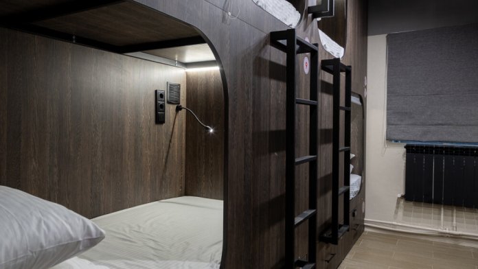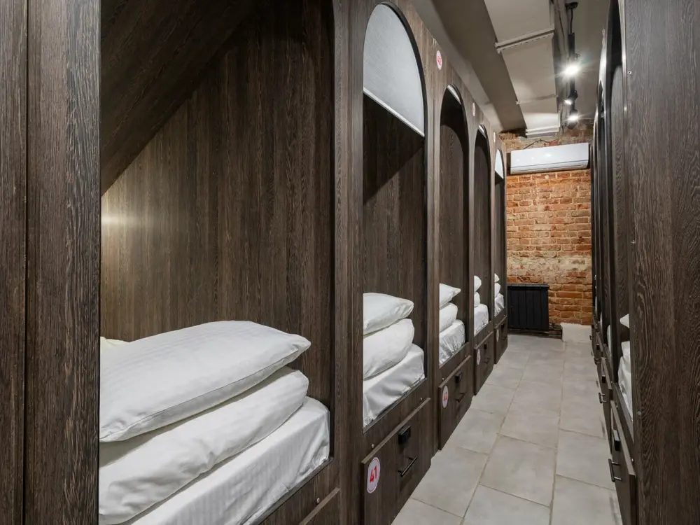 Восьмиместный номер с двухъярусными кроватями. Каждая кровать выполнена в формате капсулы, каждая капсула закрывается плотной шторкой, так же каждая капсула оснащена индивидуальным освещением, вентилятором, розеткой и бра на гибком шланге для чтения. В комнате есть кондиционер и окно.