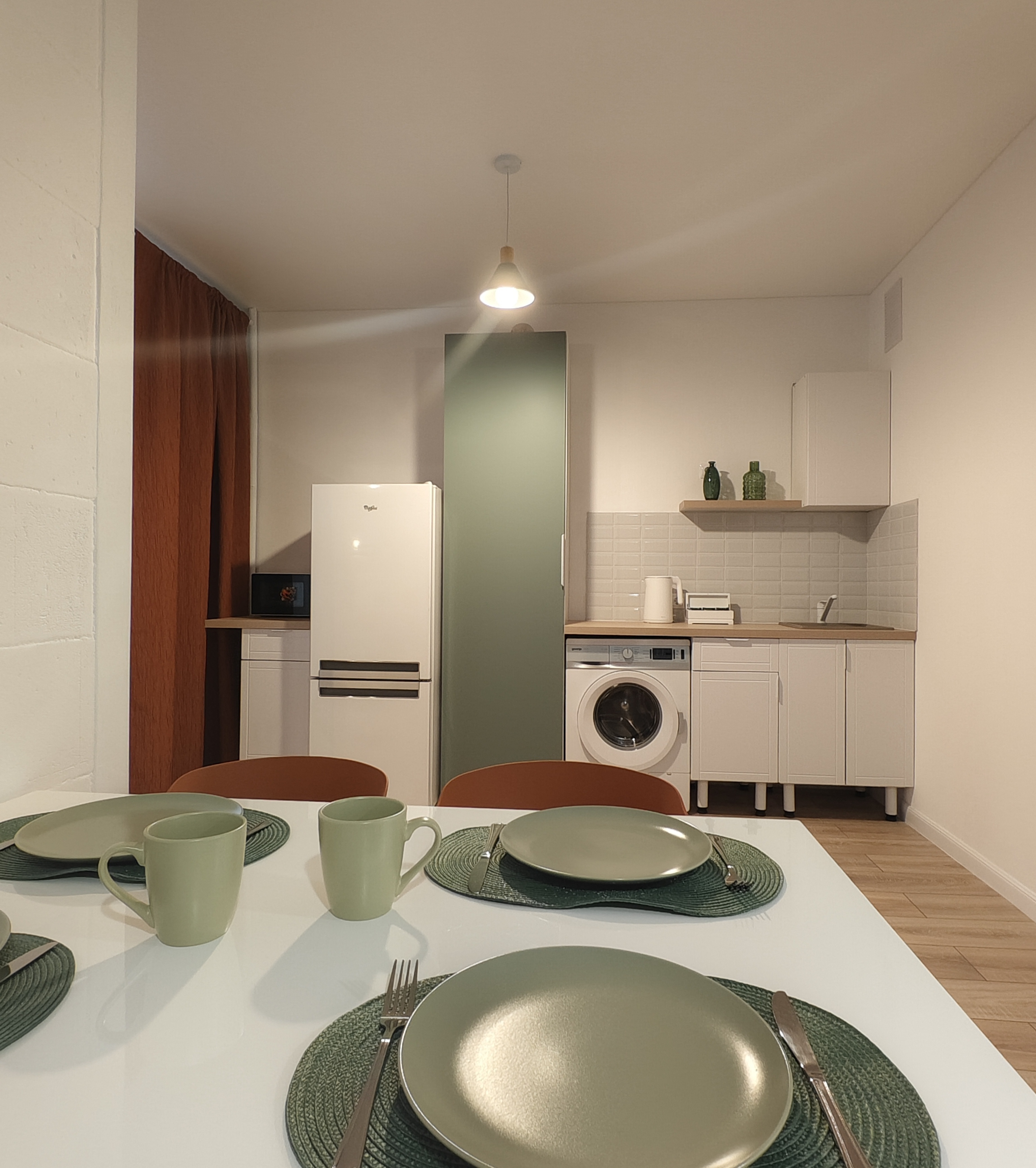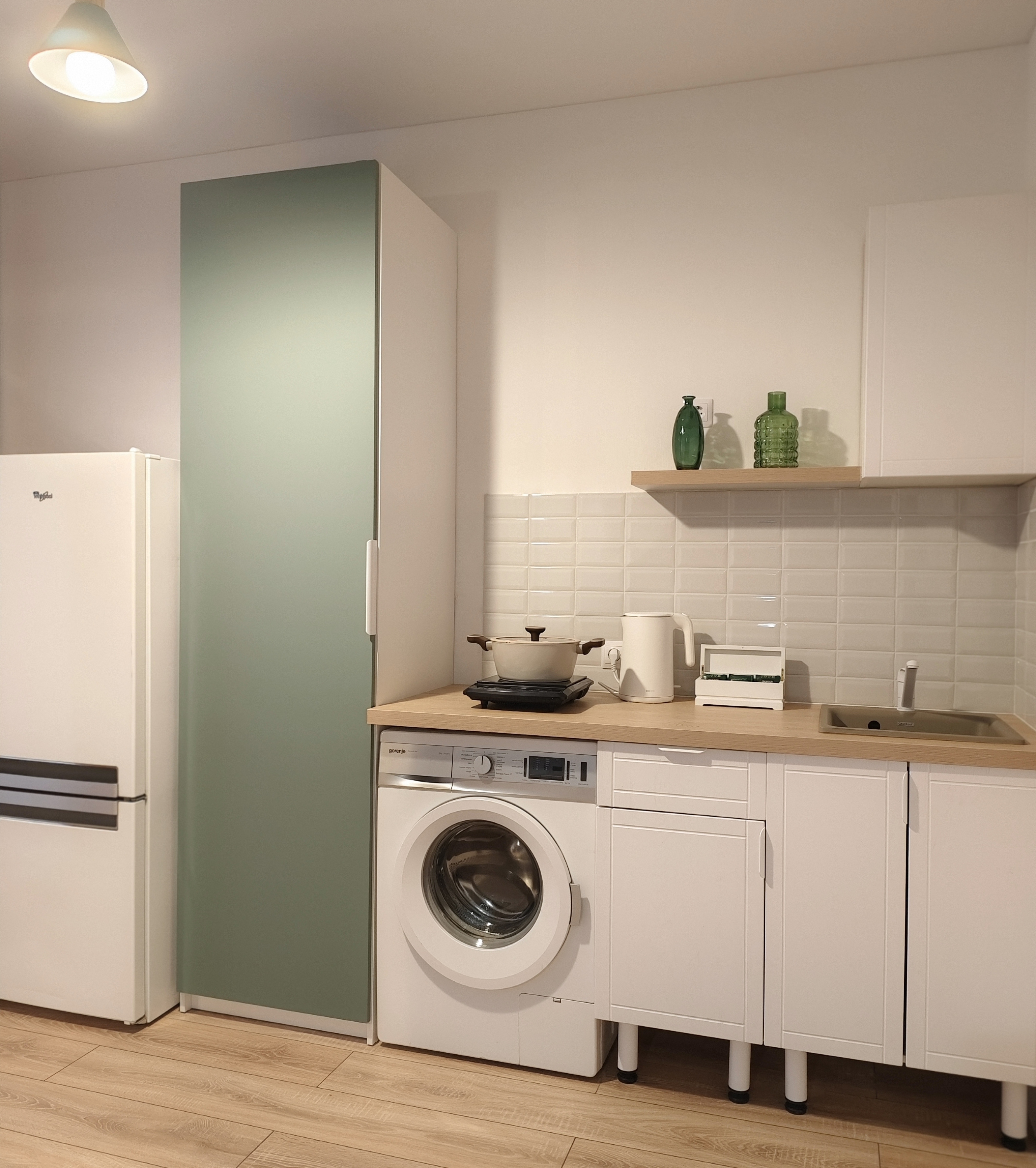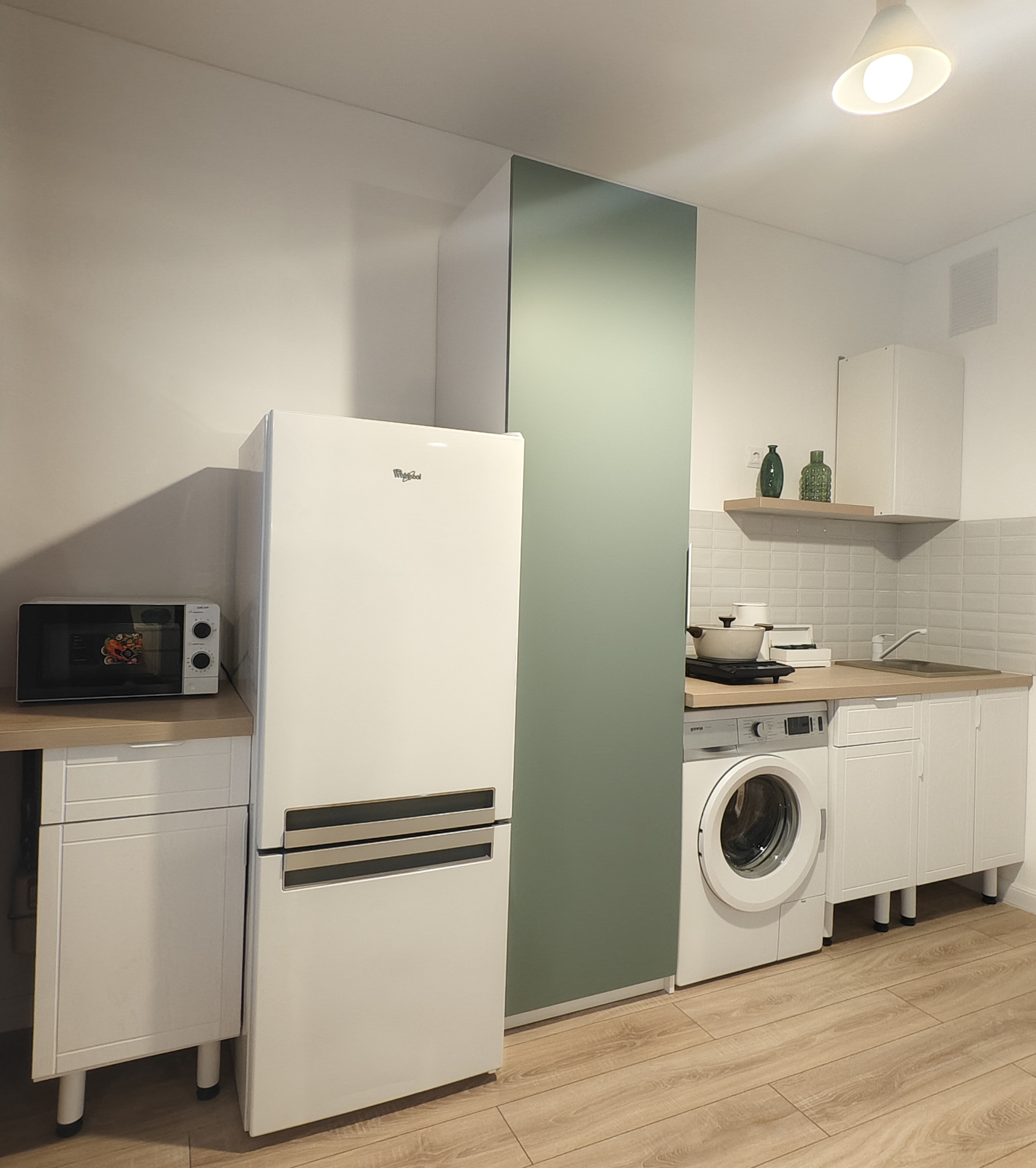 - холодильник, варочная панель, чайник, микроволновая печь, качественная посуда, фен;