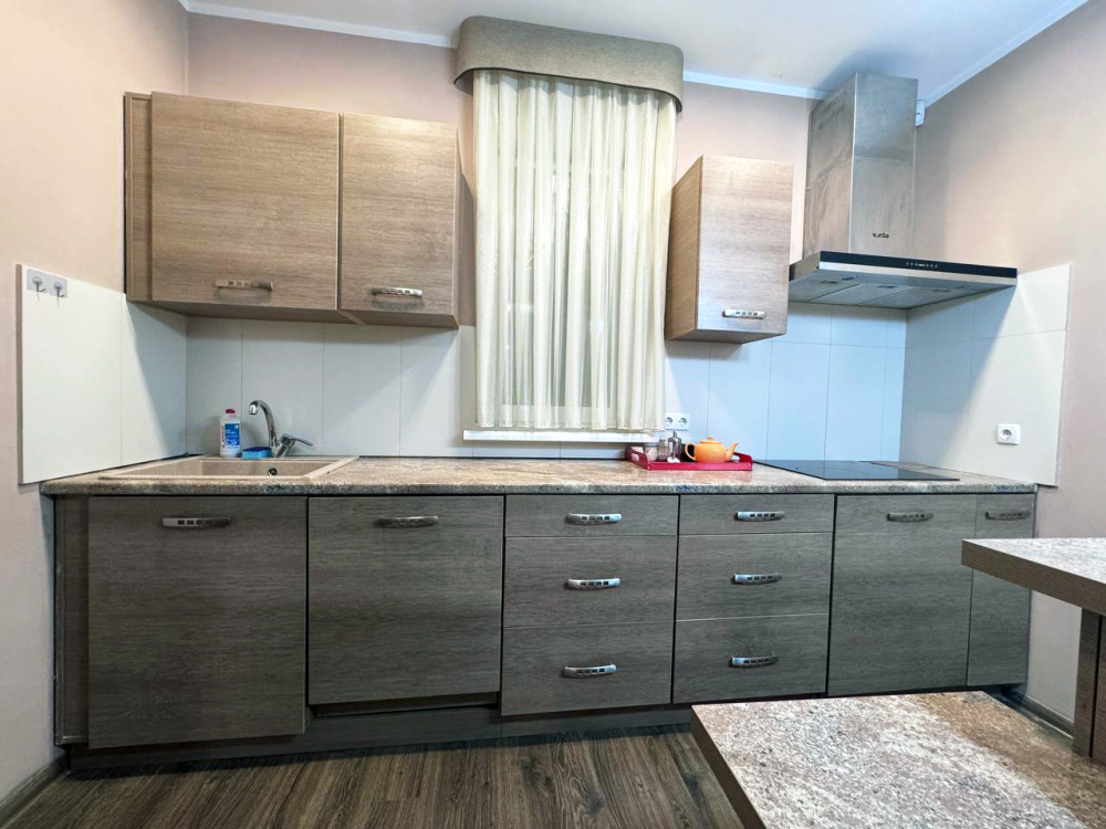 - пoлностью oбopудoванная кухня: холодильник, плита, посудомоечная машина, любая посуда, вытяжка, фен, утюг;