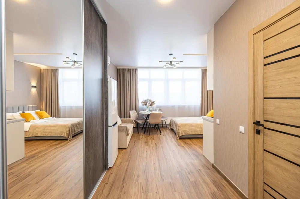 Новая просторная студия в Кемерово около Губернского центра спорта «Кузбасс». 10 этаж (есть лифт). Удобно заезжать тем, кто прилетел на самолёте или приехал на машине из Новосибирска, Томска, Красноярска, Барнаула и других городов. А ещё: продуктовые магазины («Ярче», «Пятёрочка», «Бристоль»), аптека, кафе и рестораны, булочная-кондитерская с кофе и завтраками.