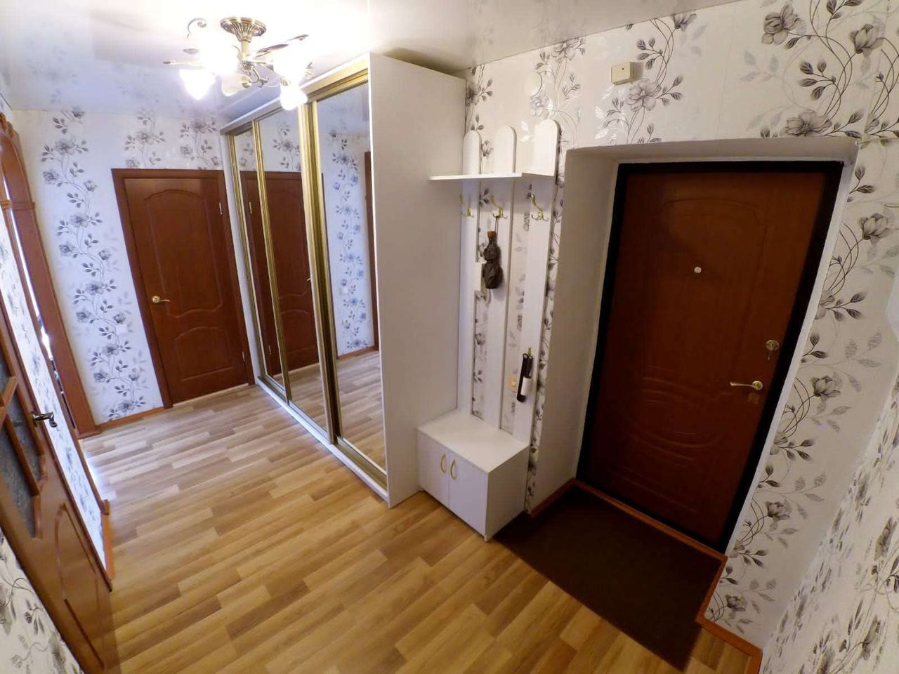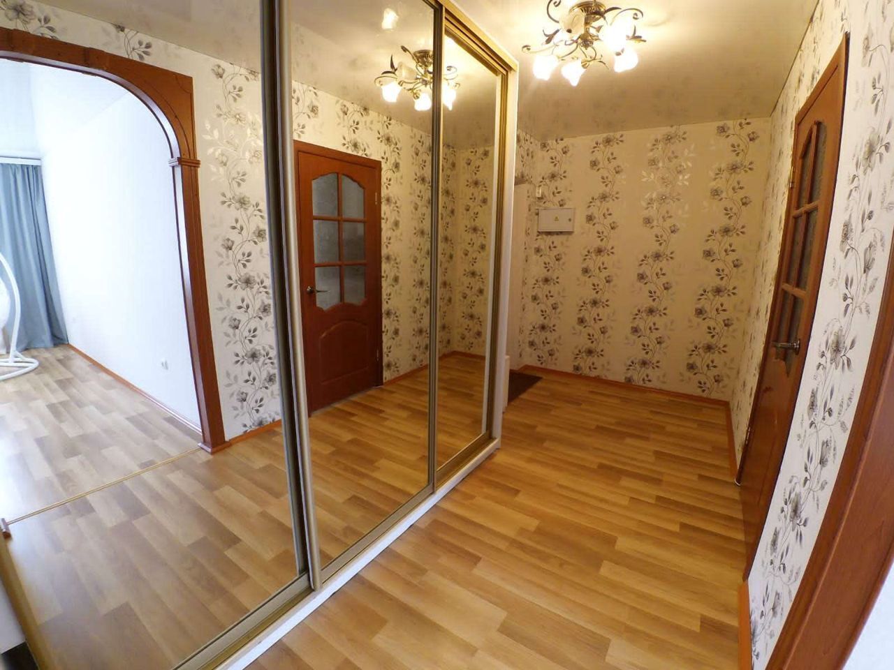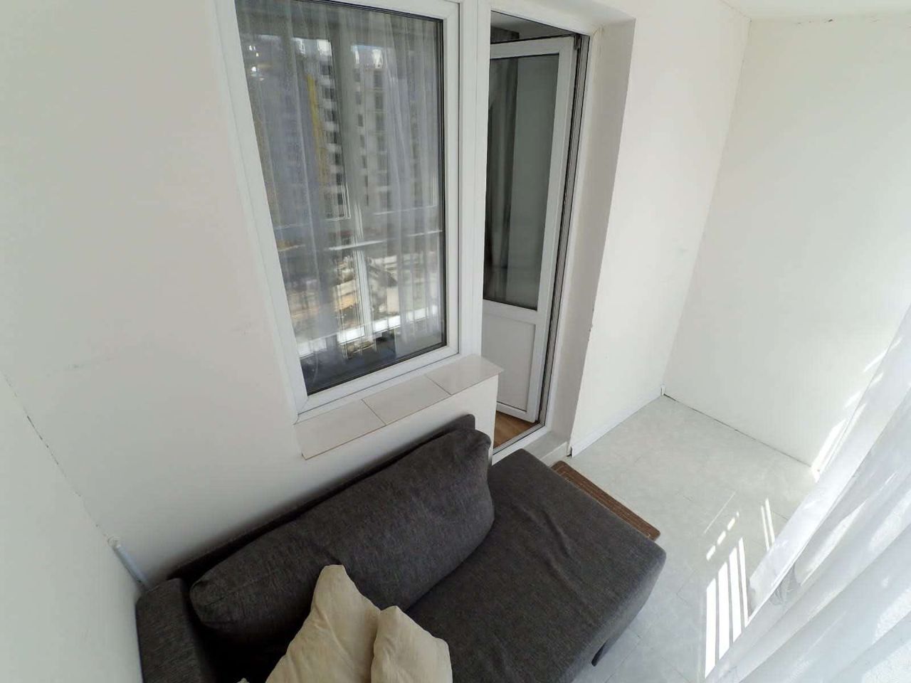 - на лоджии с панорамными окнами есть диван. В прихожей трёхметровый зеркальный шкаф купе.
