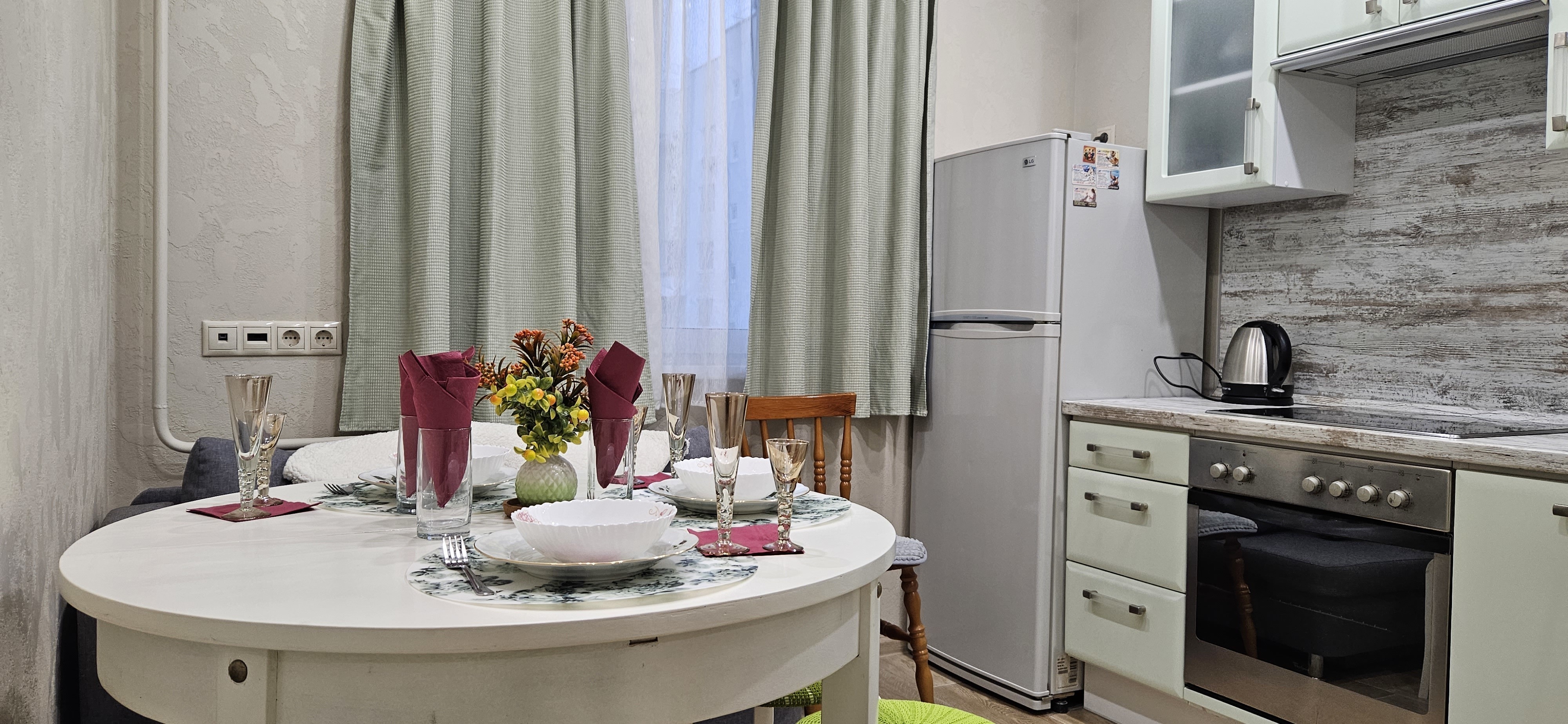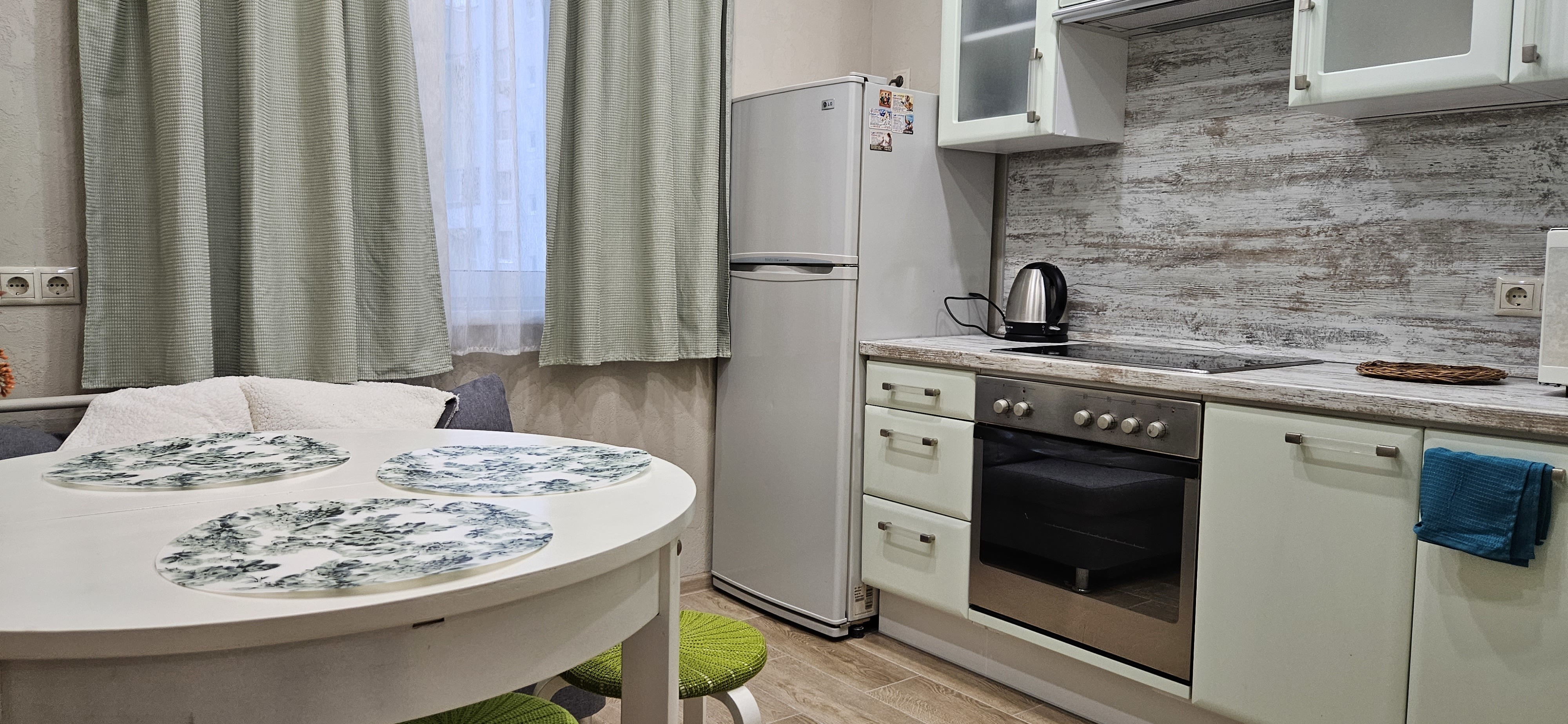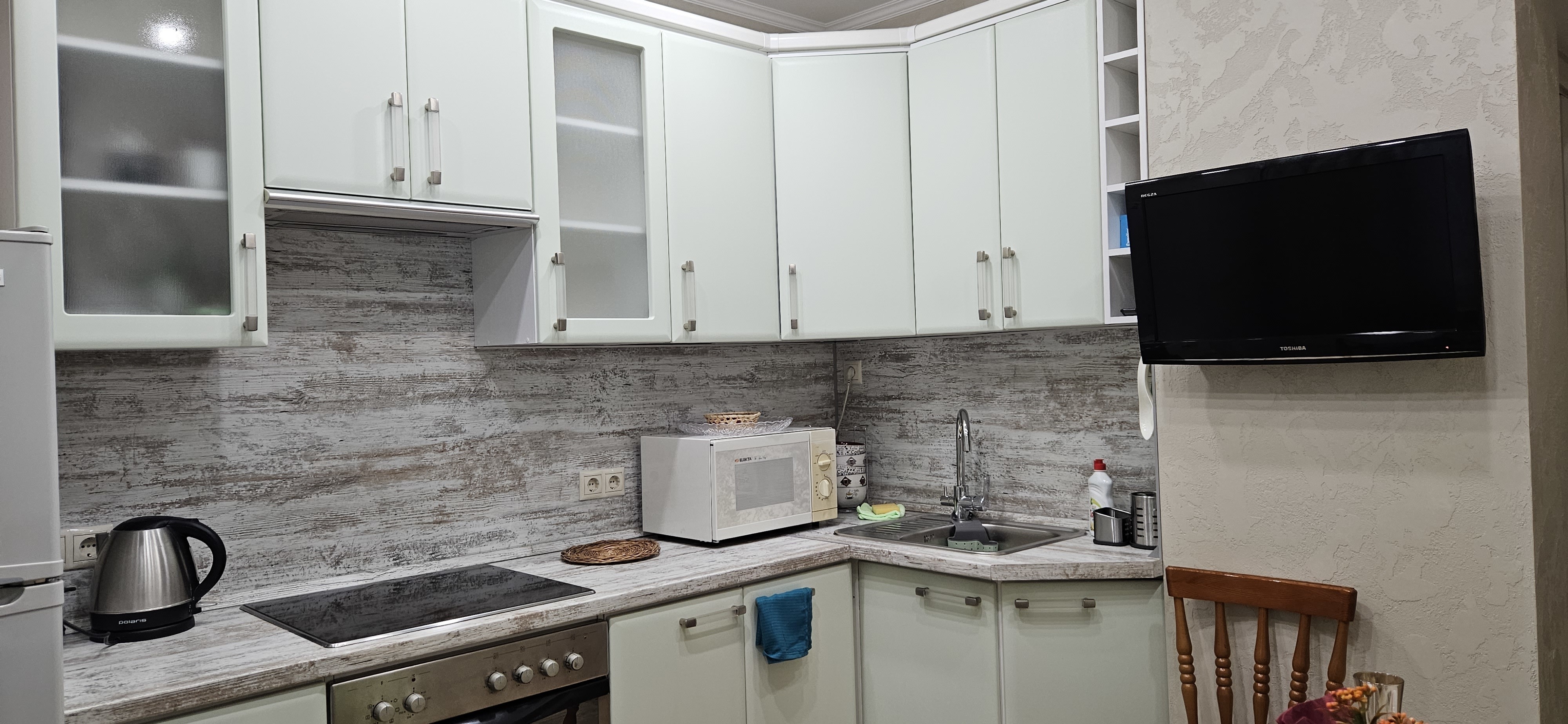 Кухня оснащена электроплитой, духовкой, вместительным холодильником, СВЧ-печью, чайником, посудой и всеми кухонными приборами.