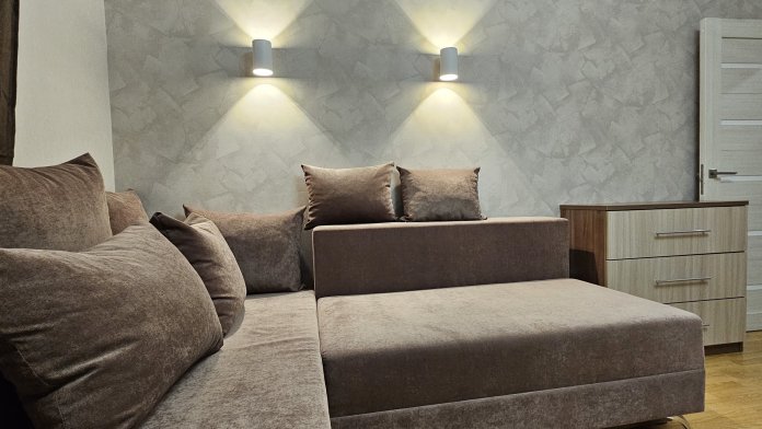 В комнате мягкая и очень удобная двуспальная кровать, диван и кресло.