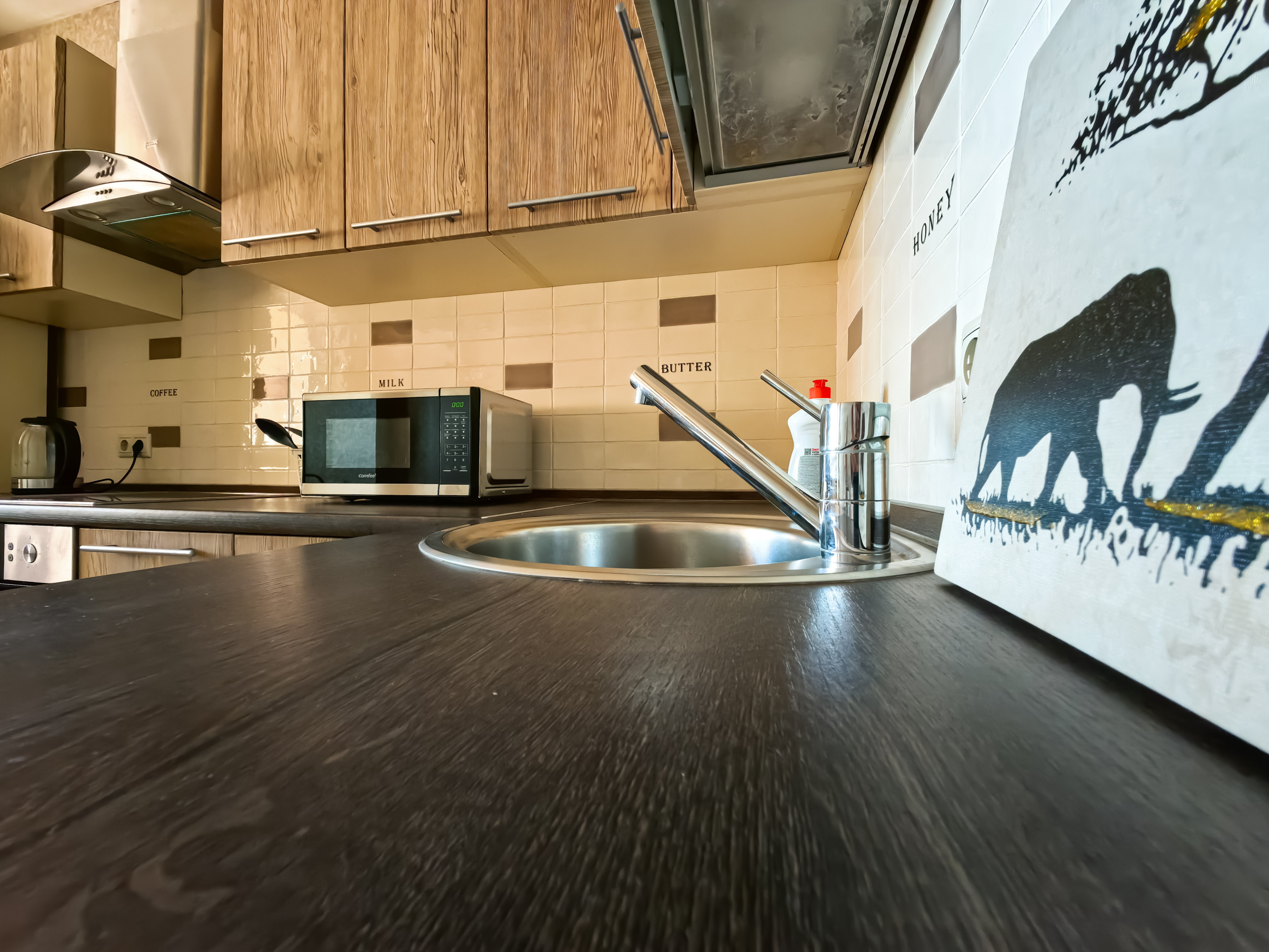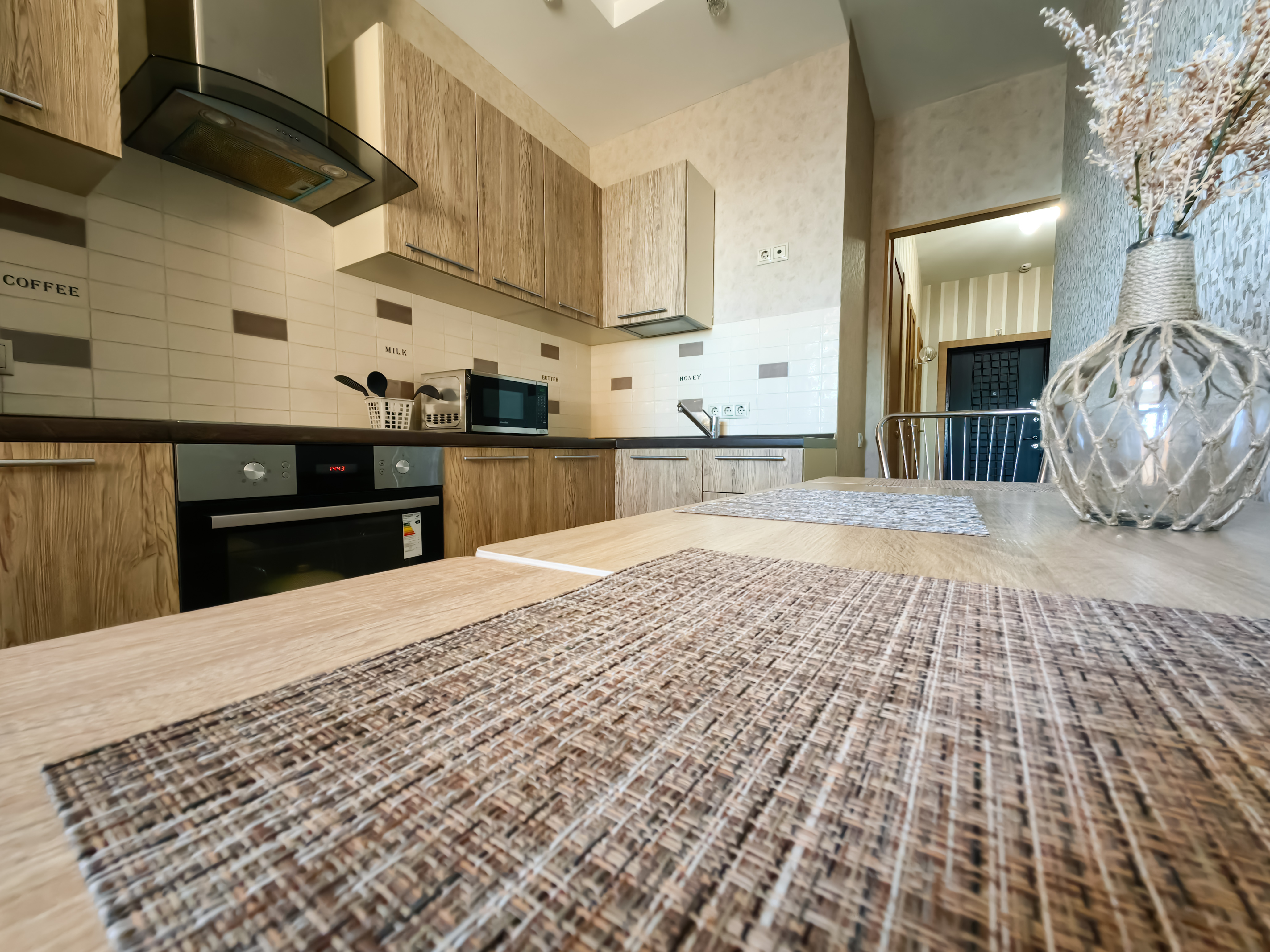 Кухня оснащена электроплитой, духовкой, вместительным холодильником, СВЧ-печью, чайником, посудой и всеми кухонными приборами.
