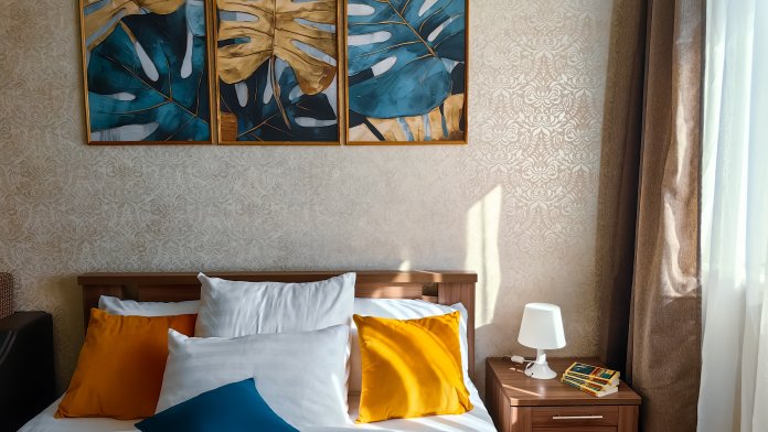 В комнате мягкая и очень удобная двуспальная кровать, диван.