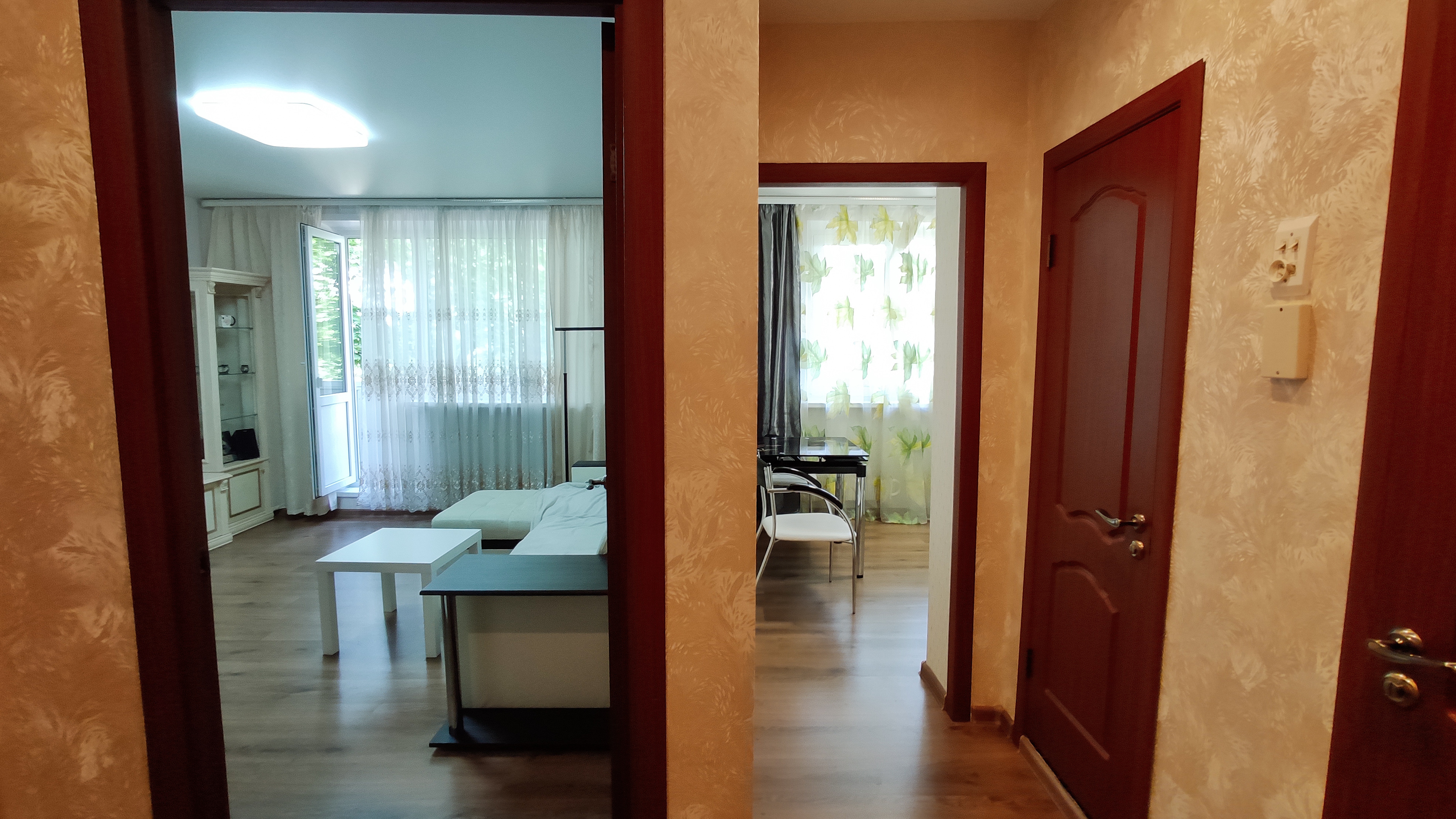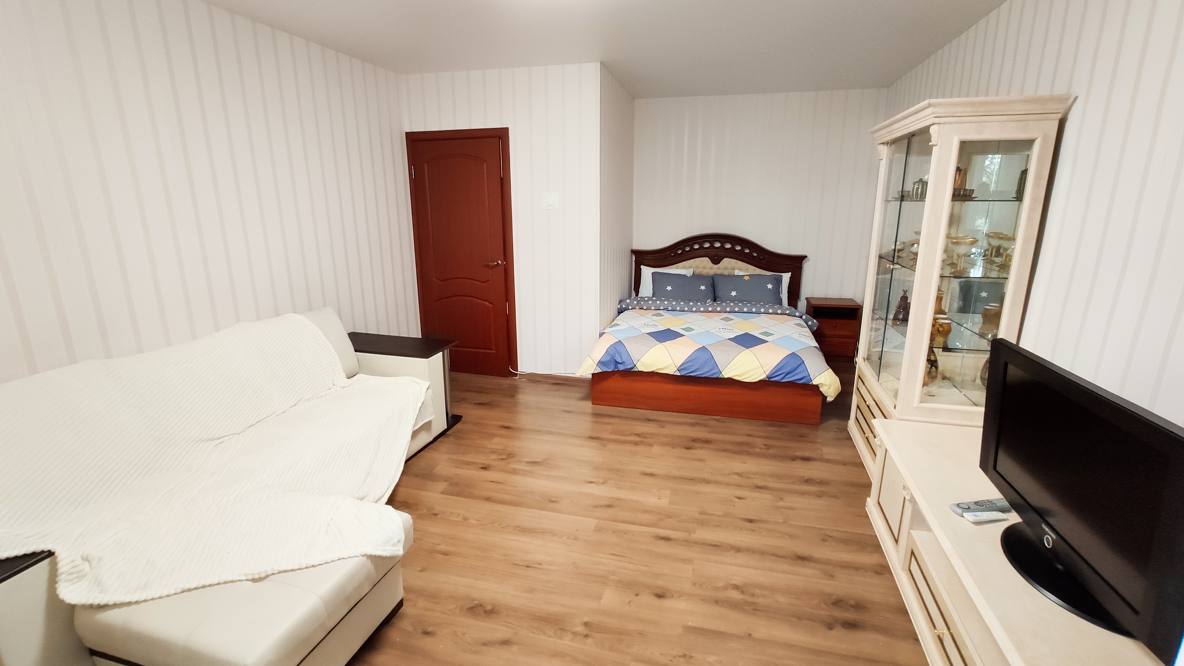 В комнате мягкая и очень удобная двуспальная кровать, угловой диван.