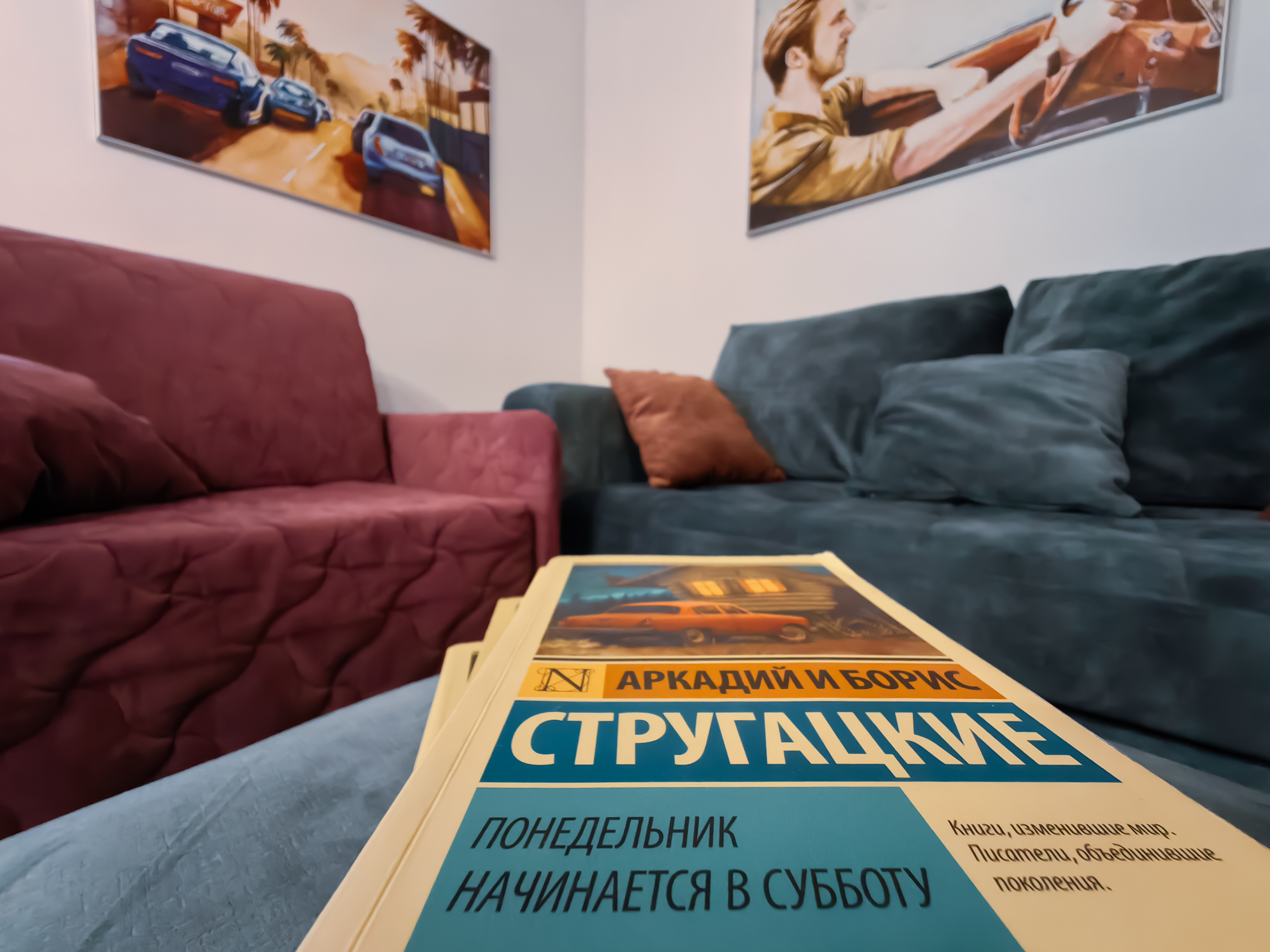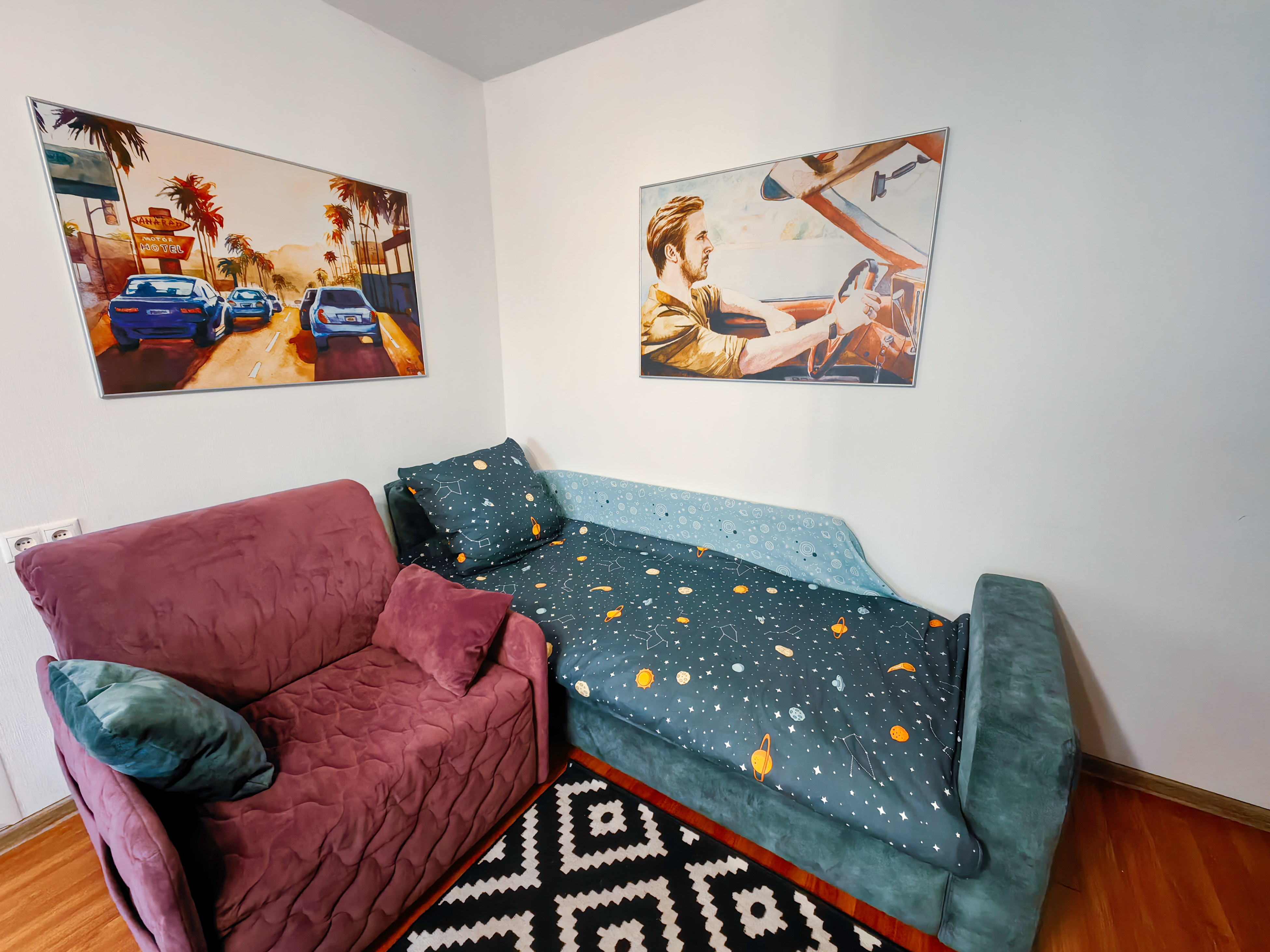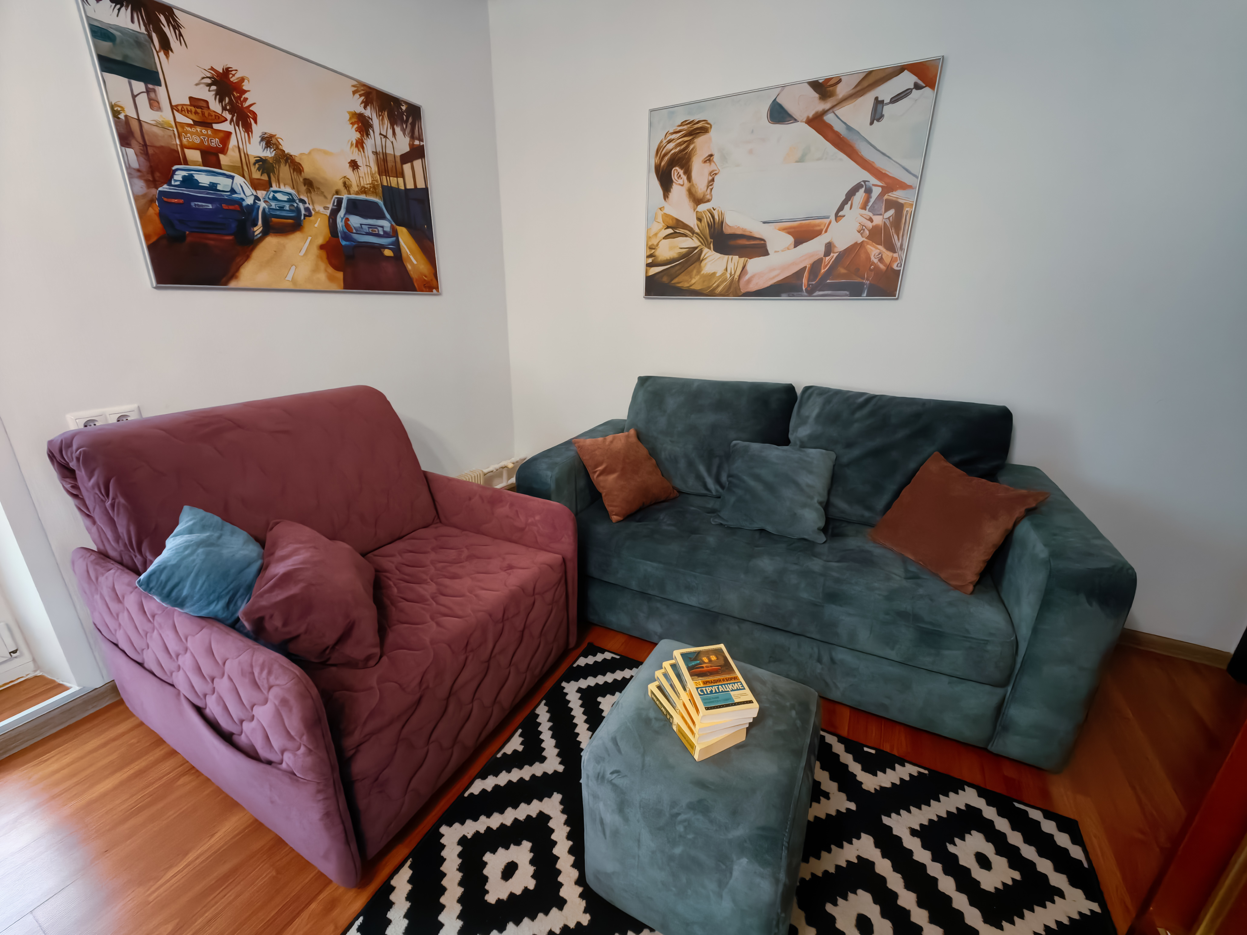 В комнате мягкая и очень удобная двуспальная кровать. Диван и кресло.