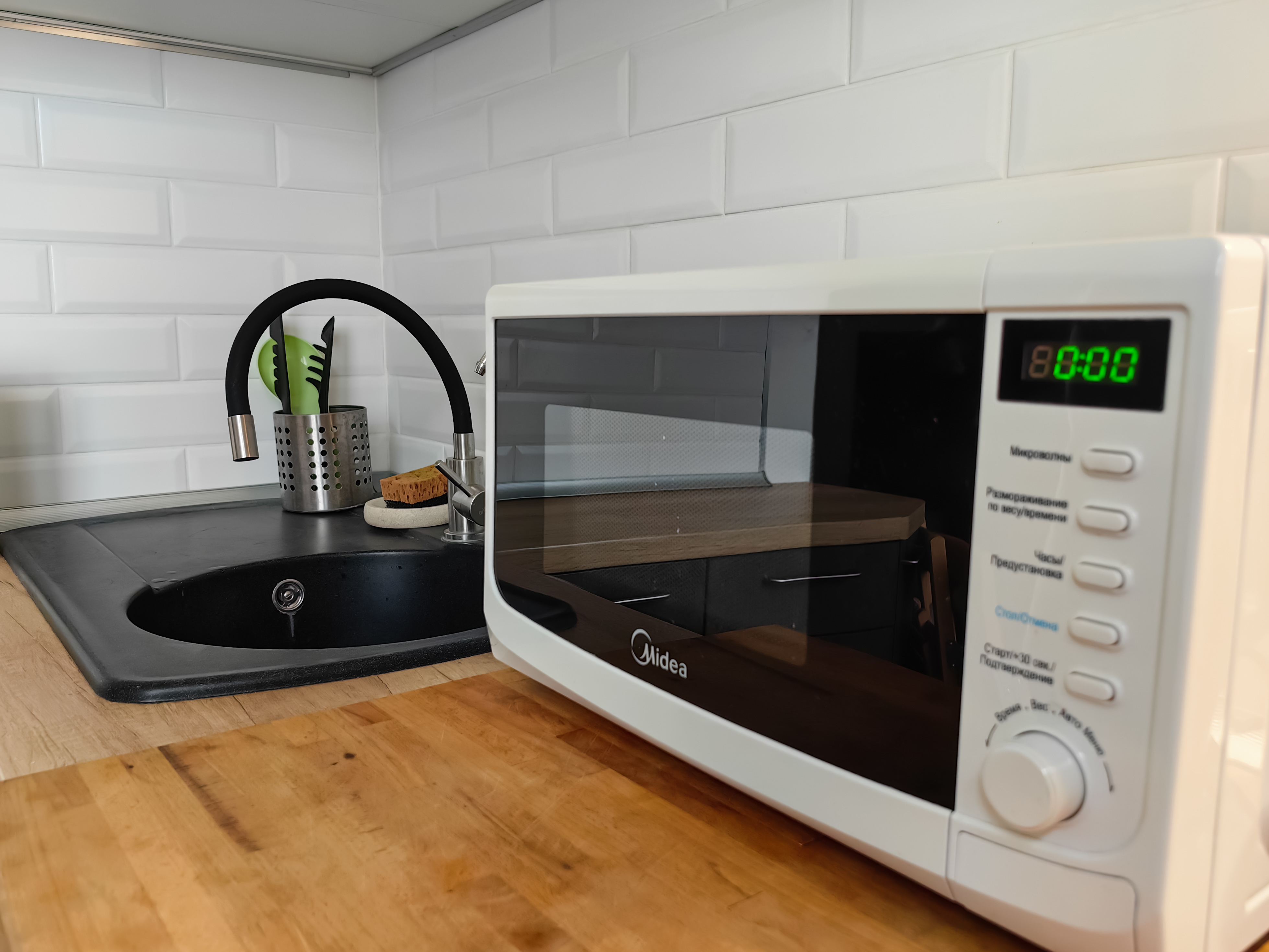 Кухня оснащена электроплитой, вместительным холодильником, СВЧ-печью, чайником, посудой и всеми кухонными приборами.