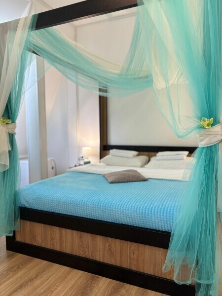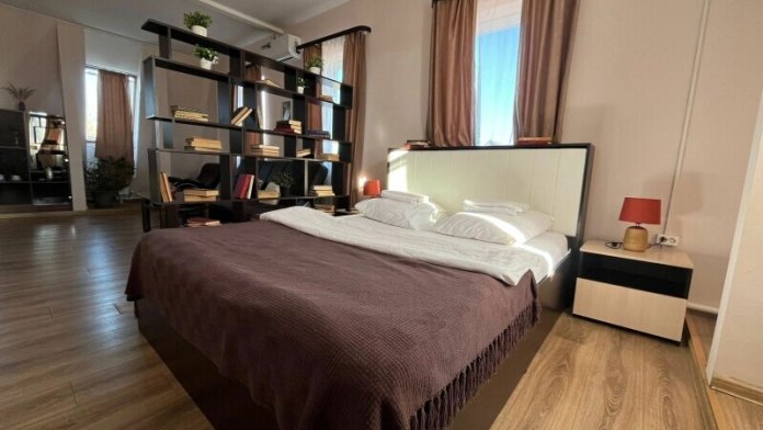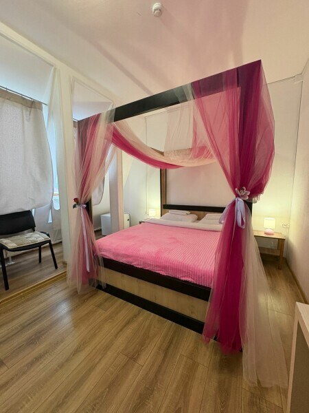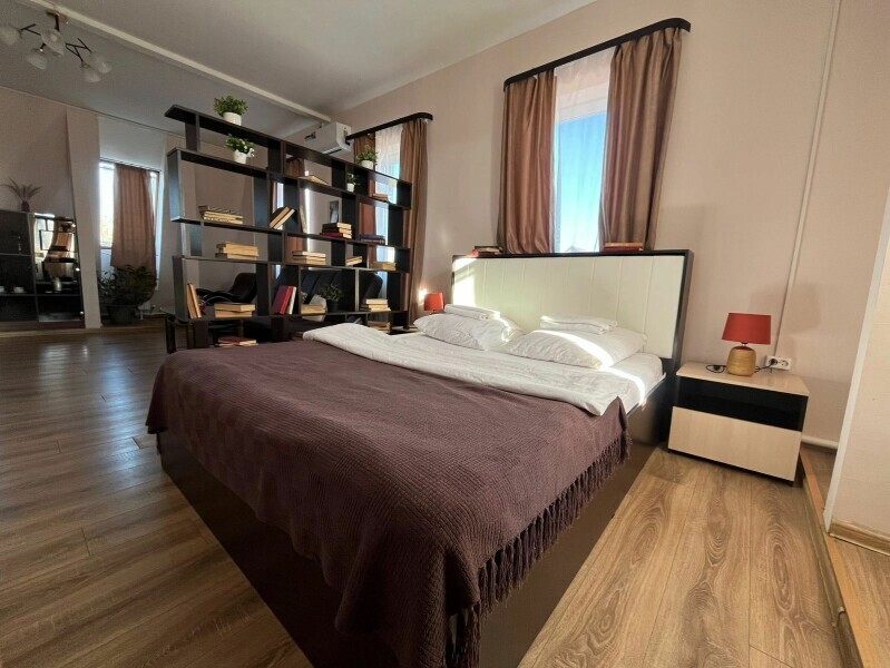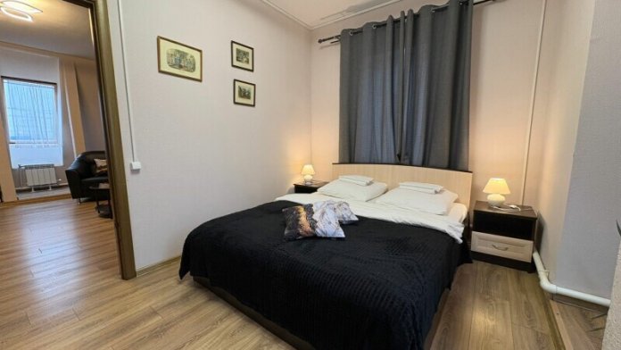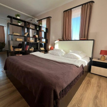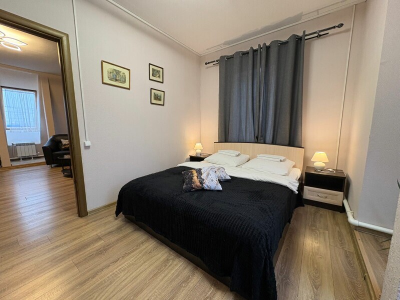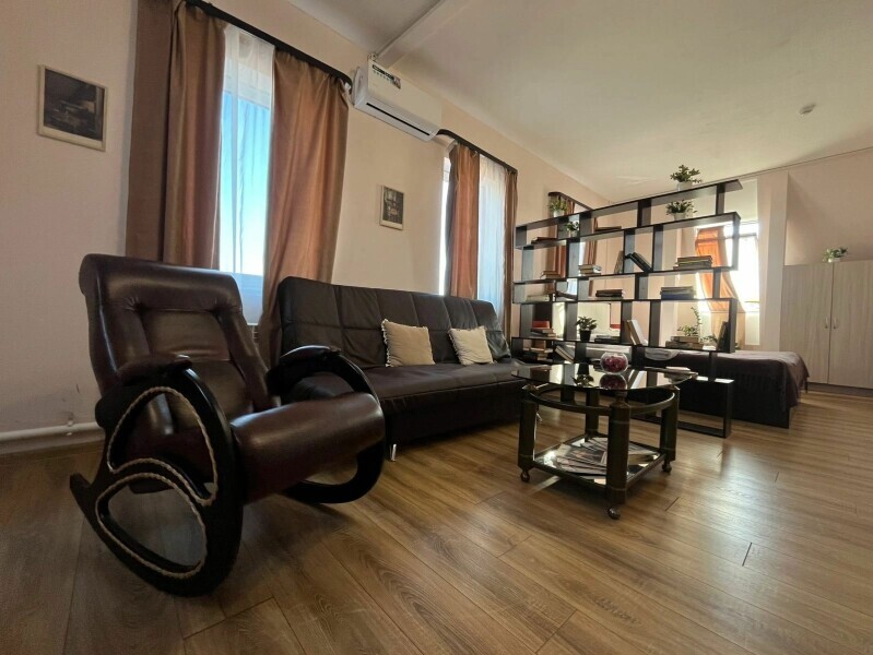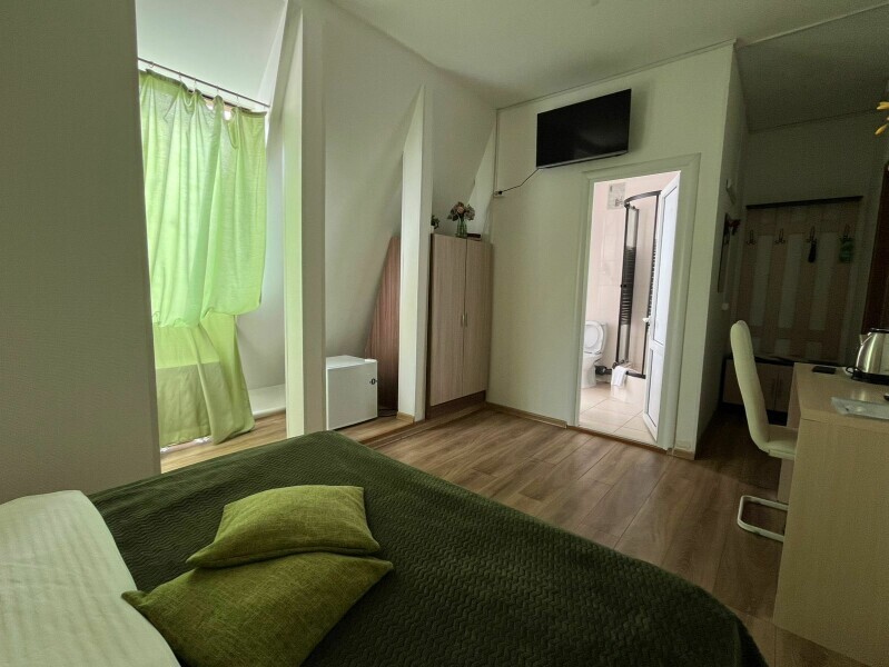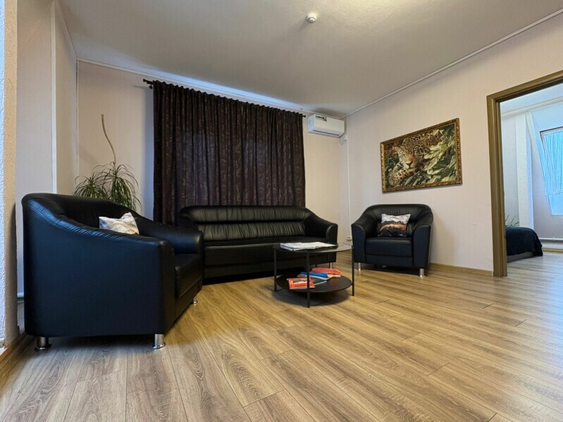 Номер, зонированный на спальню и гостиную. Оснащён всем самым необходимым для комфортного отдыха. Возможно дополнительное размещение на раскладном кожаном диване.