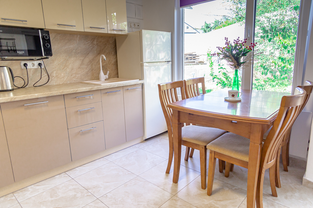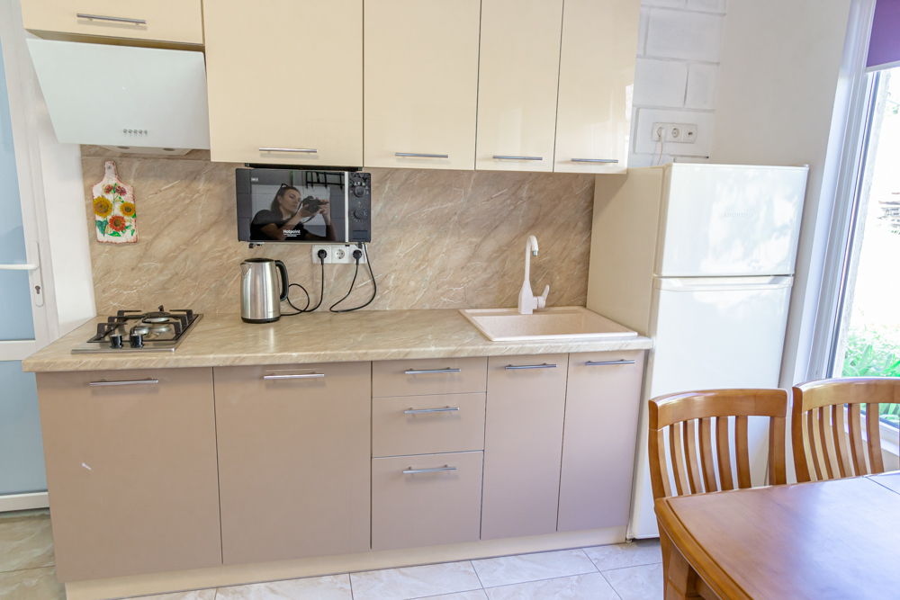 На комфортной кухне есть газовая плита, столовые приборы, набор посуды, электрочайник, микроволновая печь, холодильник