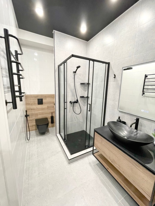 В ванной комнате: душевая кабина, гигиенический душ, стиральная машина, фен, гигиенические принадлежности (шампунь, гель для душа, мыло, ватные диски и палочки). На период сезонного отключения горячей воды предусмотрен бойлер на 80 литров.