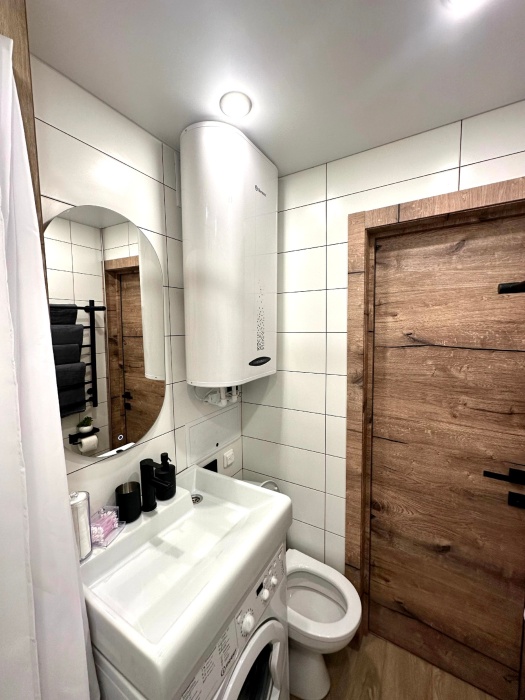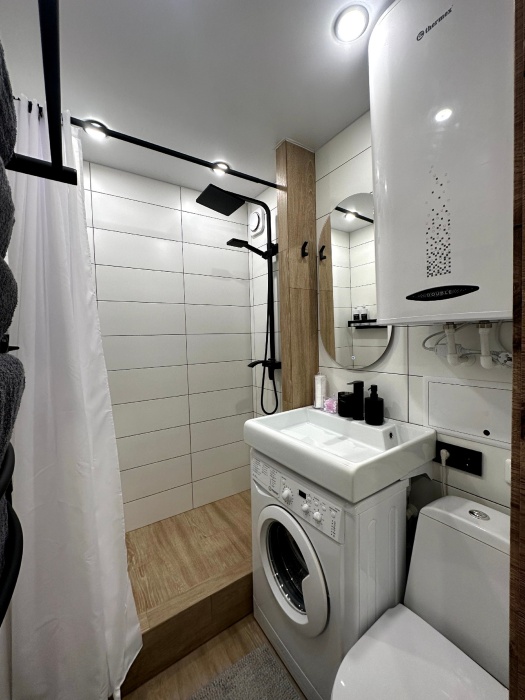 В ванной комнате: душ, гигиенические принадлежности (шампунь, гель для душа, мыло, ватные диски и палочки). На сезонные отключения горячего водоснабжения предусмотрен бойлер на 80 литров. Для Вас: фен, стиральная машина, утюг, гладильная доска и другие приятные мелочи.