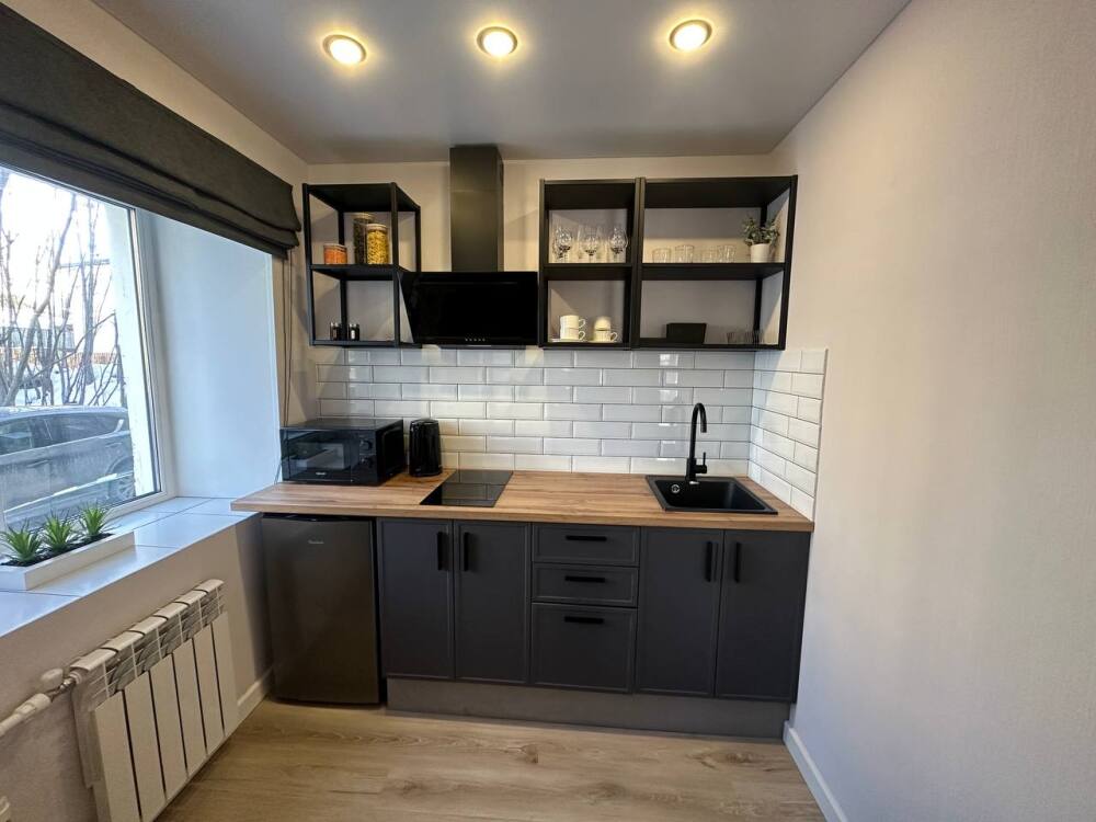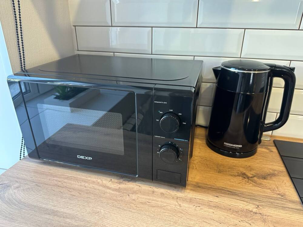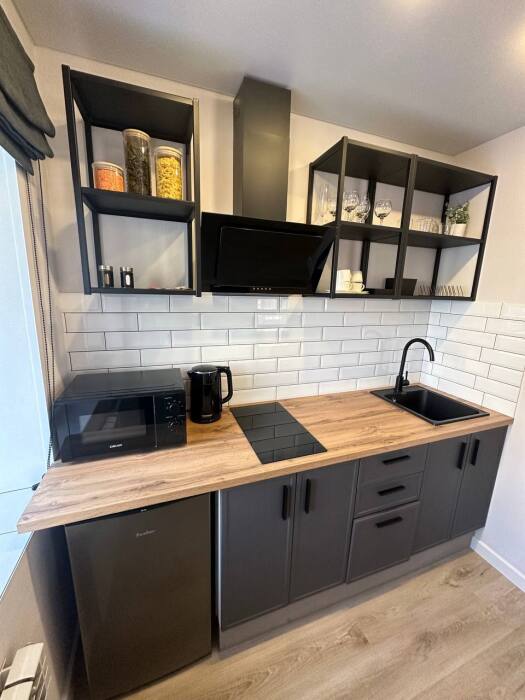 Кухня полностью оборудована мебелью и бытовой техникой (холодильник, СВЧ-печь, электрический чайник, индукционная варочная поверхность). Есть вся необходимая посуда для приготовления и приема пищи. Для Вас у нас всегда есть чай, сахар, соль.
