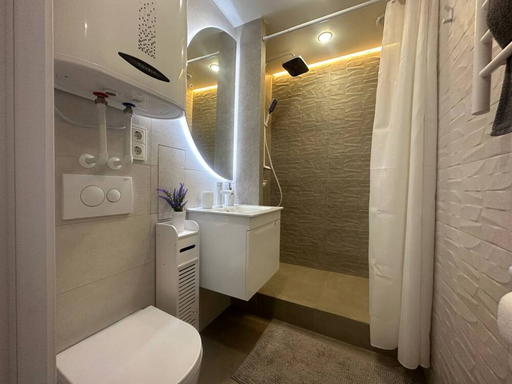 В ванной комнате: гигиенические принадлежности (шампунь, гель для душа, мыло, ватные диски и палочки), фен. Стиральная машина, утюг, гладильная доска и другие приятные мелочи. На сезонные отключения горячей воды предусмотрен бойлер на 80 литров.