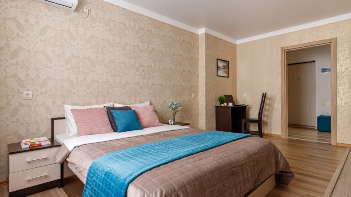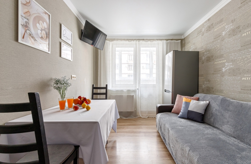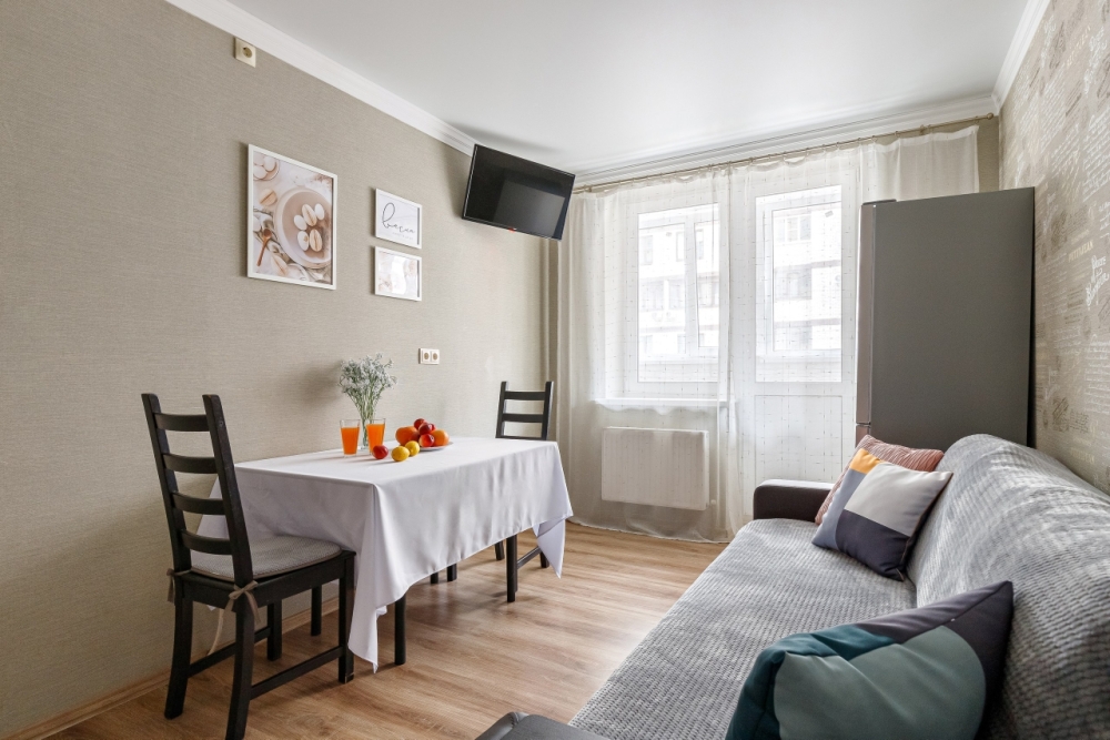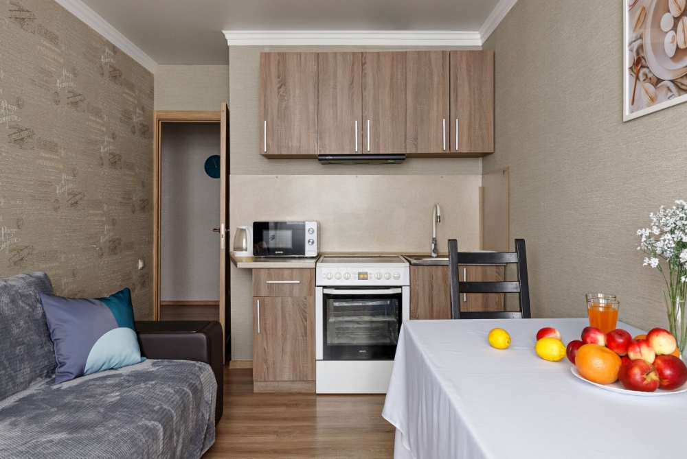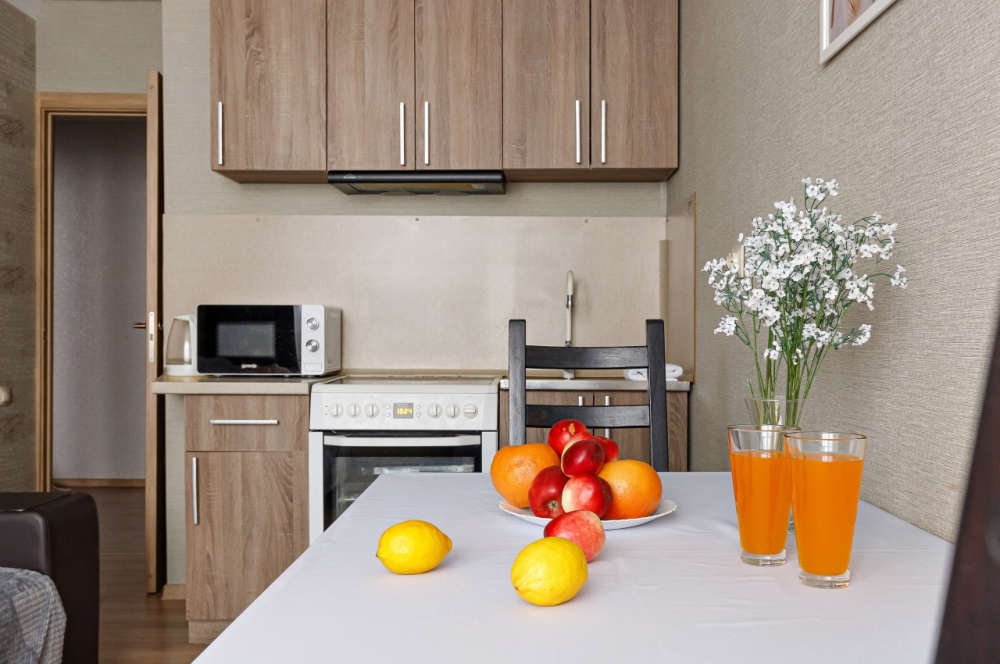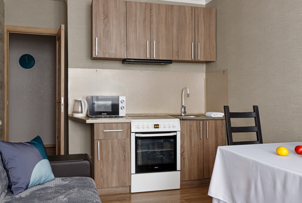 Квaртира укомплектованная бытовой техникой : холодильник, чайник, кондиционер, стиральная машина, телевизор, фен, утюг, гладильная доска.