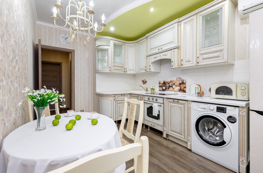 Квaртира укомплектованная бытовой техникой : холодильник, чайник, кондиционер, стиральная машина, телевизор, фен, утюг, гладильная доска.