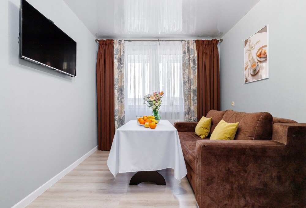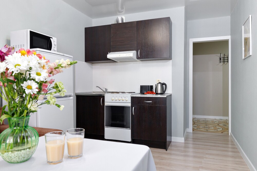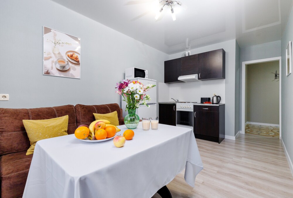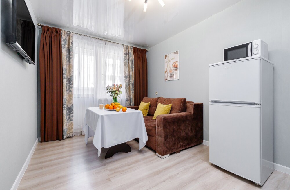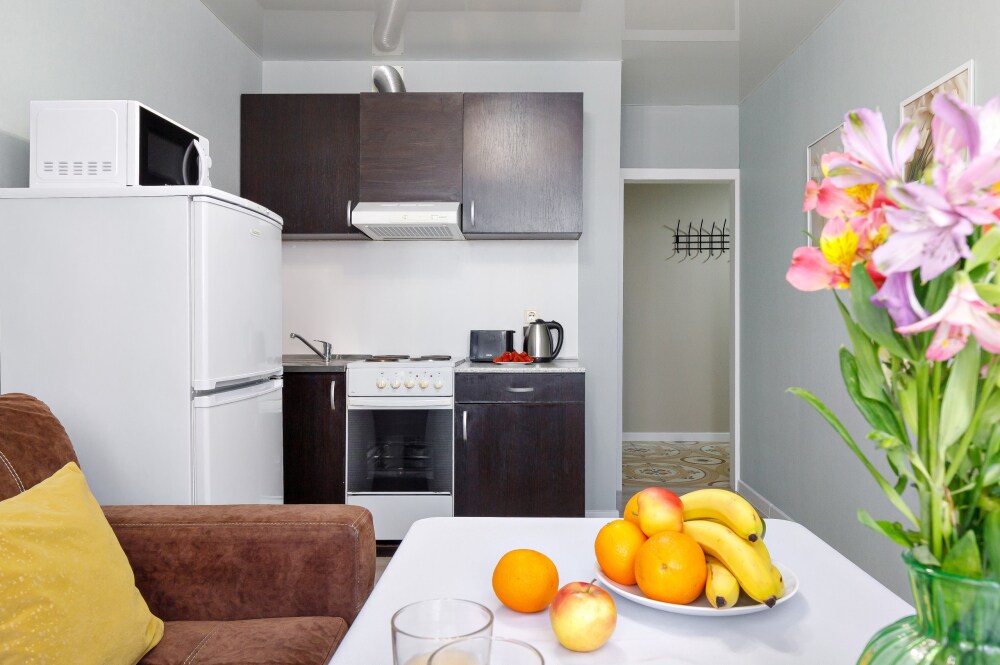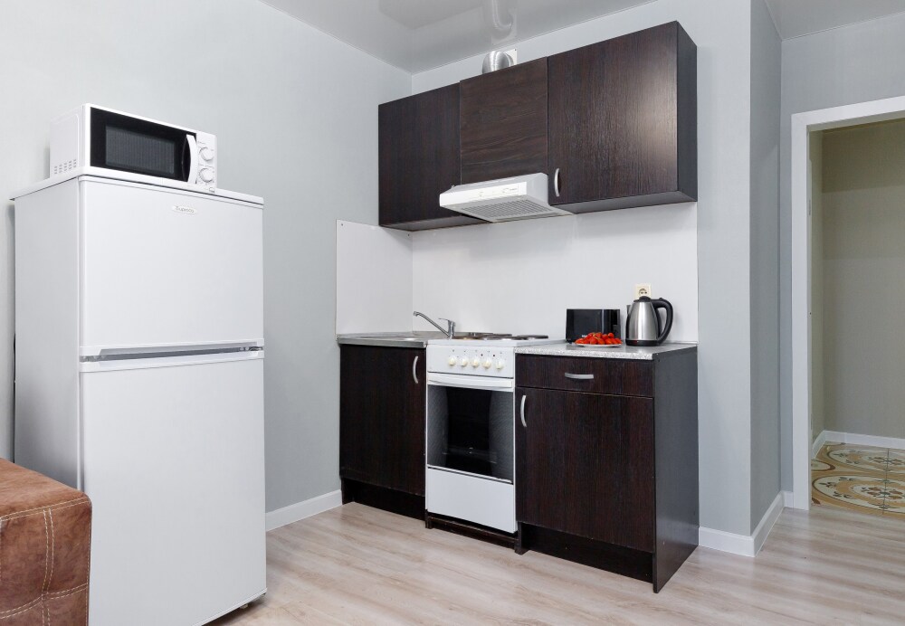 Квaртира укомплектованная бытовой техникой : холодильник, чайник, кондиционер, стиральная машина, телевизор, фен, утюг, гладильная доска.