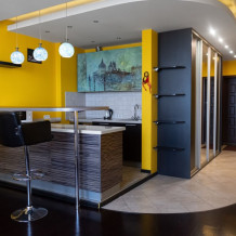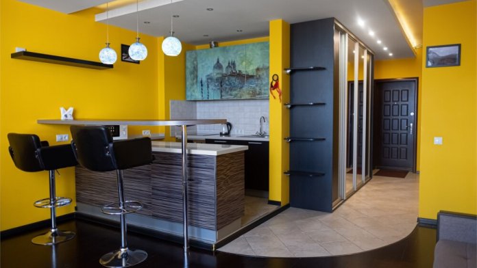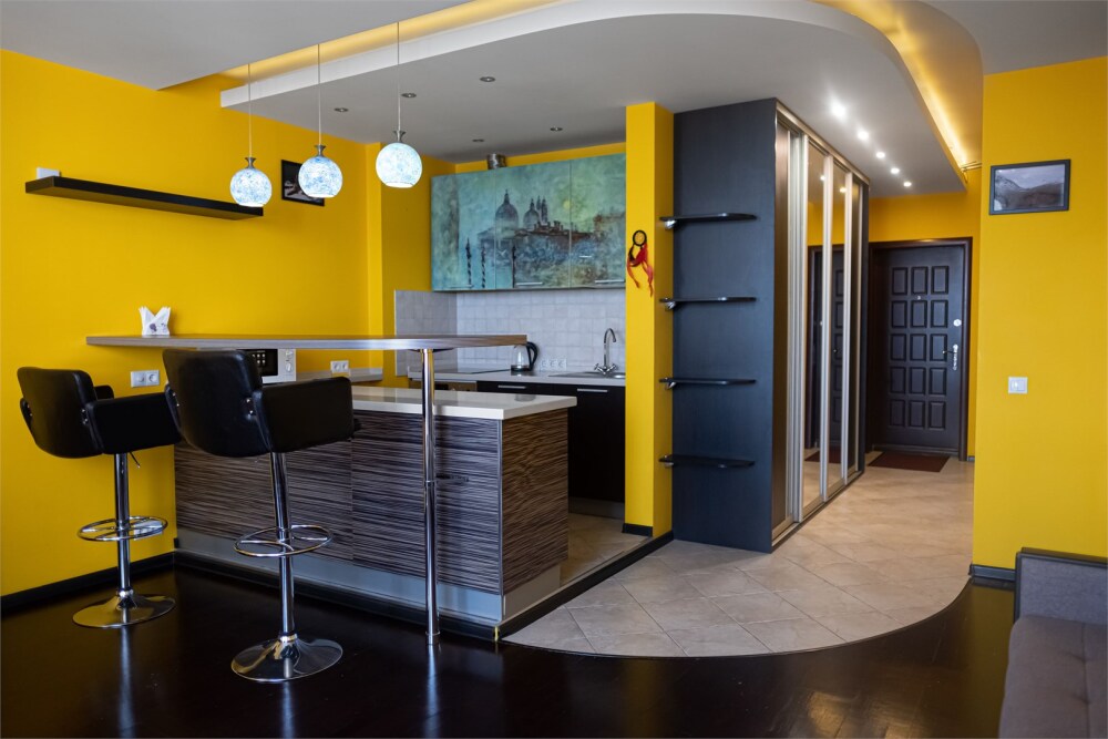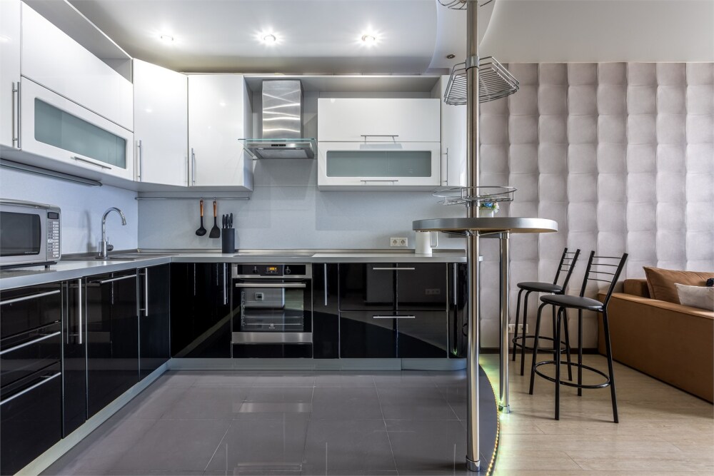 Современная студия с барной стойкой в черно-белых тонах для компании друзей или семьи.