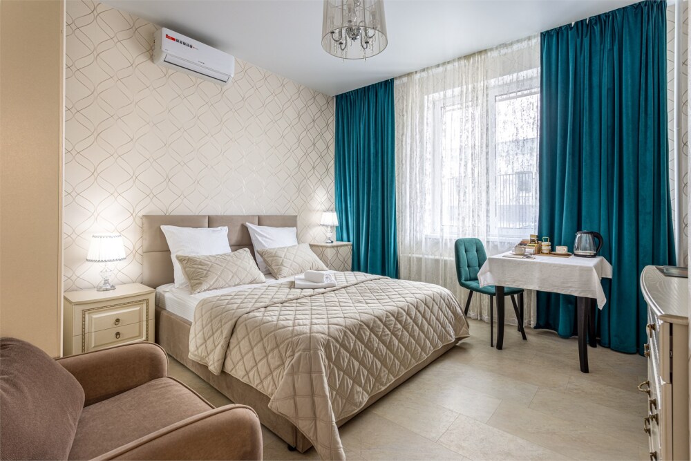Уютная тихая студия с окнами во двор. Прекрасно подойдет для отдыха пары или семьи из трех человек.