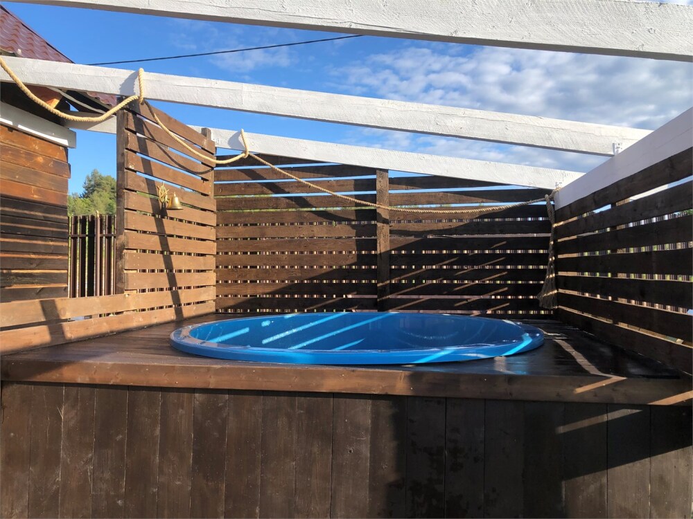 Купель на террасе: теплая купель с гидромассажем и ночной подсветкой. Доступна в сезон с апреля по октябрь.