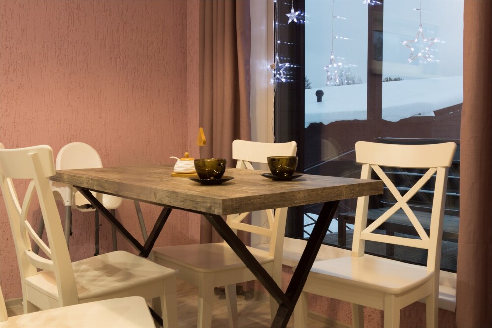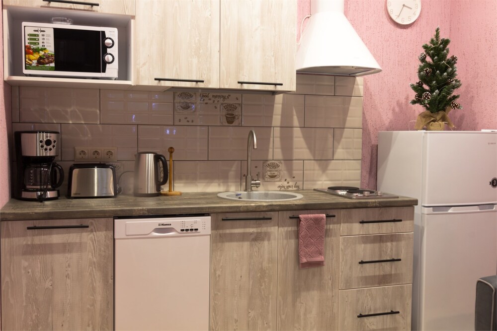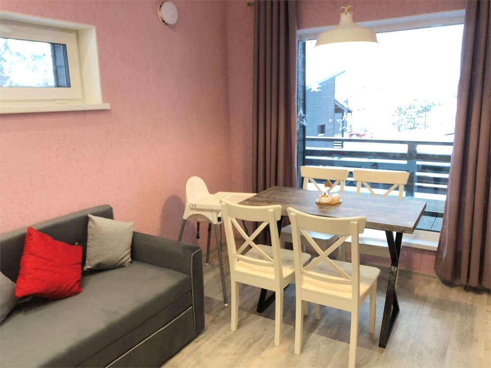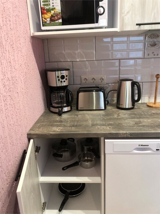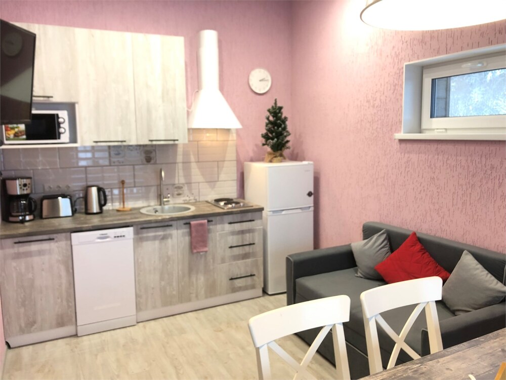 - 1 спальня и лофт, полностью оборудованная кухня-гостиная, туалет, душ, телевизор, холодильник, микроволновая печь, посудомоечная машина, стиральная машина, чайник, кофеварка, тостер, утюг. Есть вся посуда.