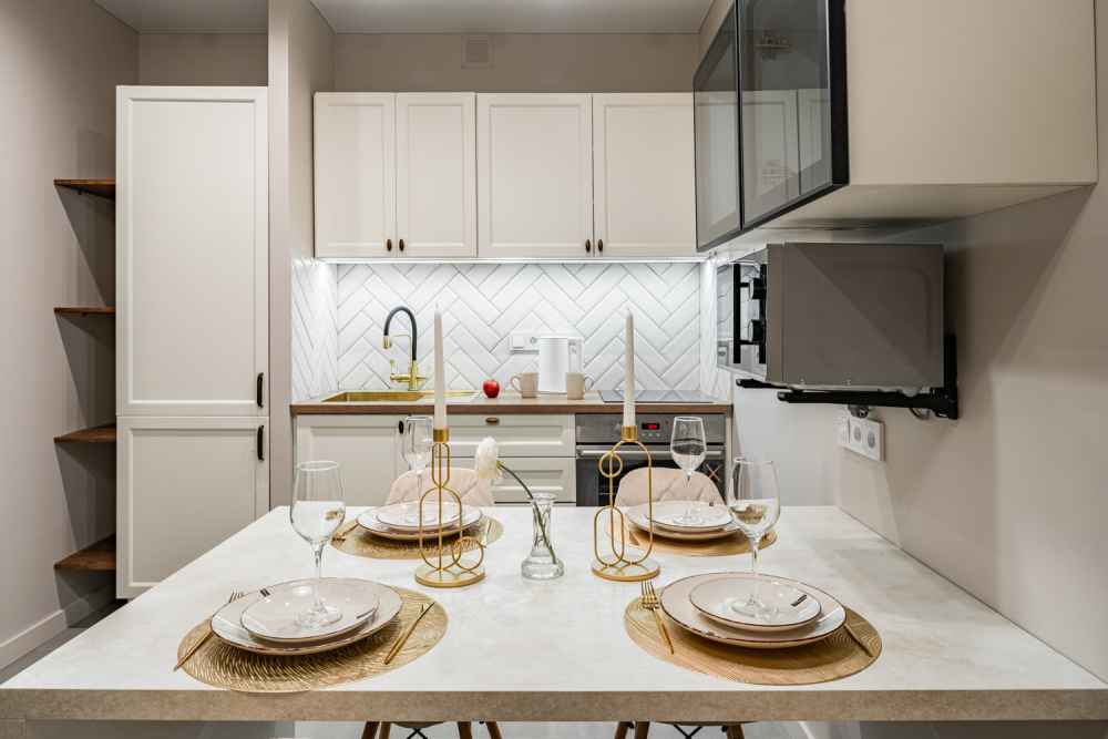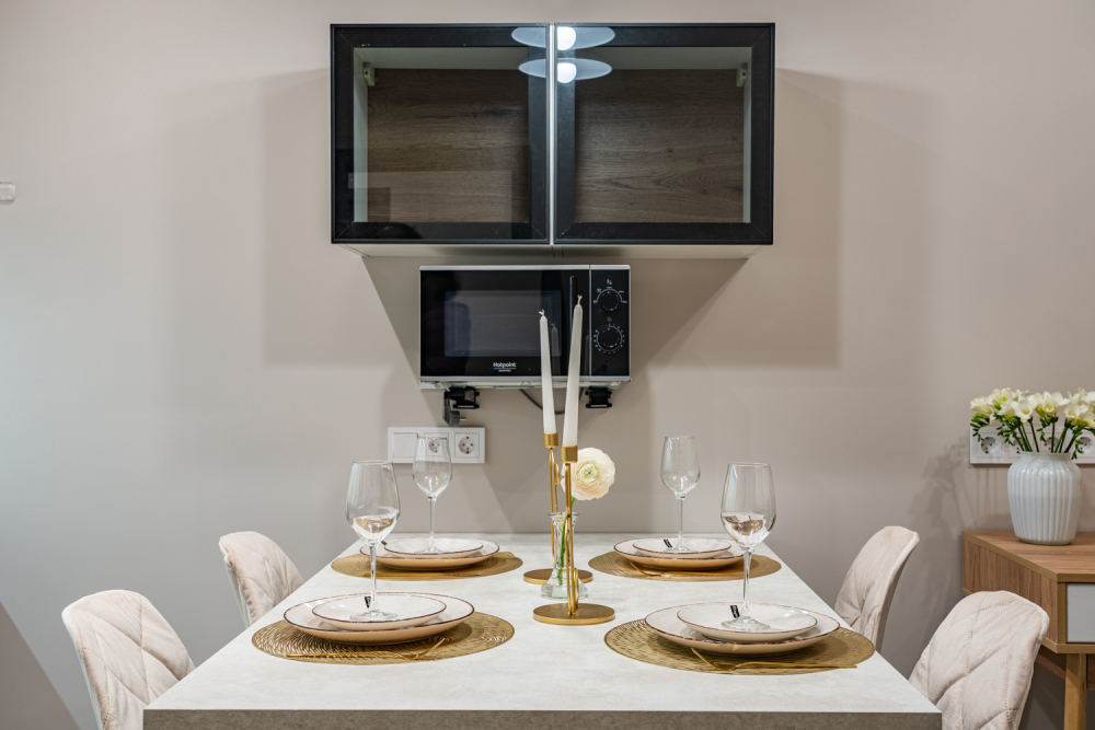 - Духовой шкаф, индукционная плита, микроволновка.